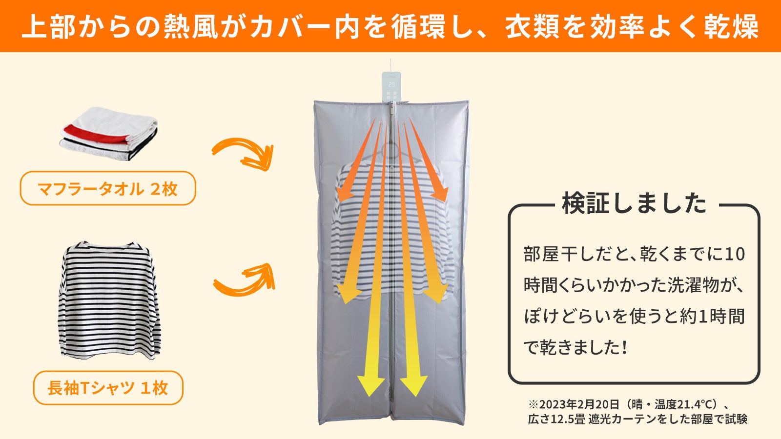 コンパクトで設置簡単、1時間速乾の衣類乾燥機。長い服も乾かせ、電気代はドラム式の3分の1。