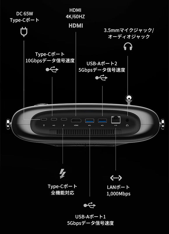 ビデオ出力:HDMI(4K@60Hz)、Type-Cポート(4K@60Hz)