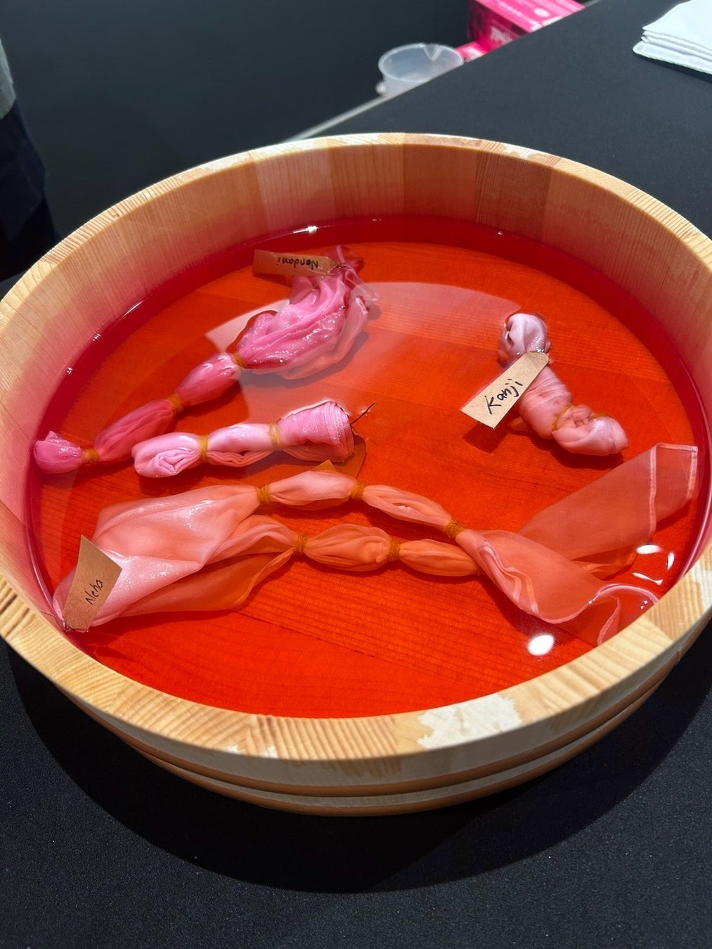 参加者に白地のハンカチを配り、それぞれがハンカチを折って絞り模様をつくり、紅花の染め液に浸します。その中に触媒液を加え、化学反応によって染め上がる工程を体験していただきました。