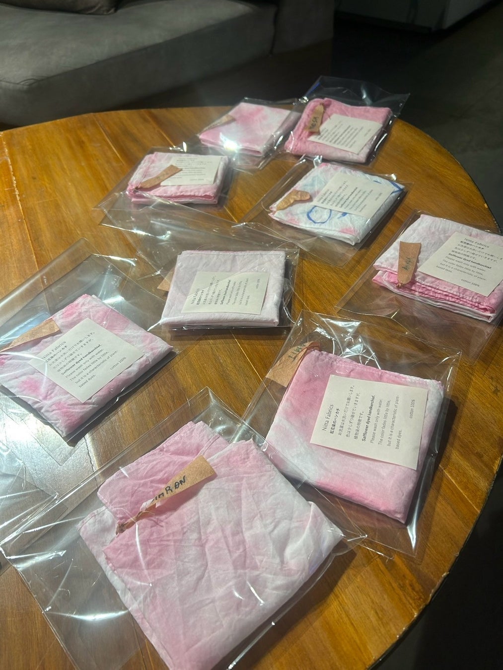 この日のワークショップでは、紅花染の染料から淡いピンク色の薄紅(うすべに)に染め上がり、約30点の一人ひとり異なる模様のハンカチが仕上がりました。