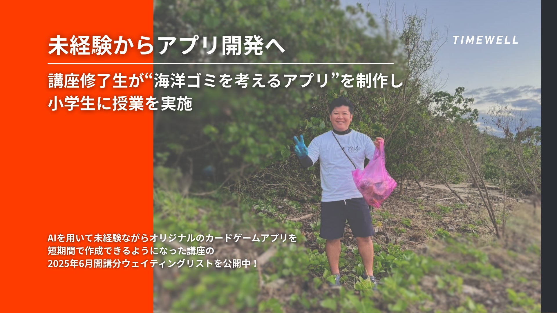株式会社TIMEWELL(本社:神奈川県横浜市、代表取締役:濱本隆太、以下「TIMEWELL」)はTIMEWELLが提供する若手テクニカルアントレプレナー「WARP」の修了生 松原英考氏が海洋ゴミを考えるアプリを作成し、石垣小学校の小学生へ授業を実施したことをお知らせします。WARPは2025年6月開講分のウェイティングリストを公開しており、登録いただいた方には募集開始のタイミングで通知いたします。