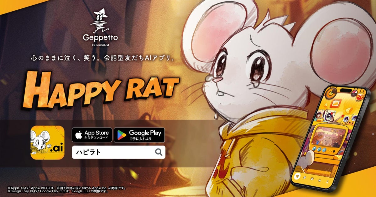 SpiralAIが自社開発した感情特化型LLM「Geppetto」を搭載した、会話型友だちAIアプリ『HAPPY RAT』。笑ったり・泣いたり・拗ねたりと、感情豊かに反応するAIキャラクターたちと自然な会話を楽しむことができ、まるで友だちと話しているような、心地よい時間を提供します。