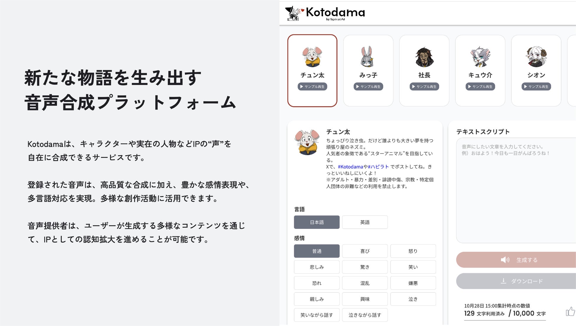 日本のエンターテインメントにおいて、「声」はキャラクターの人格や物語そのものであり、声の提供者の想いと創造性が宿る重要な要素です。SpiralAIは、音声AIを“生の声を置き換える技術”ではなく、声の魅力を引き出し、新しい表現を共に生み出すための技術として位置づけています。