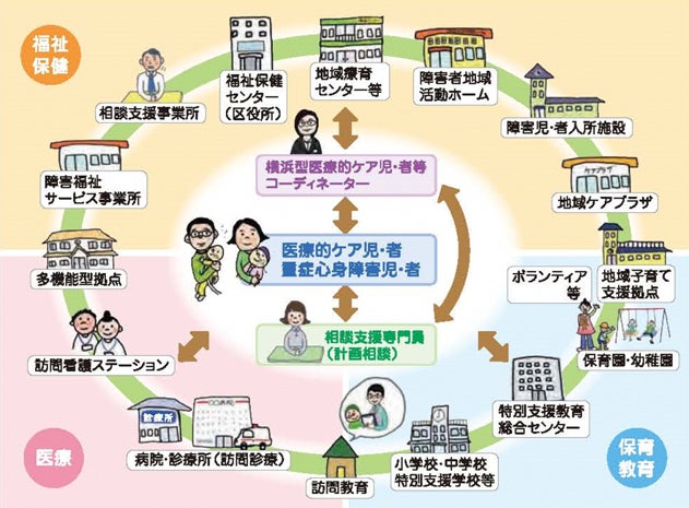市役所内関係4局の分野に横串を刺す協力体制により、定期的に話し合いを持ち、分野に偏ることがないよう医療的ケア児者支援策について考え、常に先進的な施策の展開を実施。日本最大の政令市である横浜市の取り組みは他の自治体の模範となる。