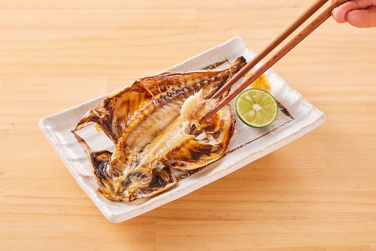 塩水に漬けられた魚の開きは、年間を通じて温度と湿度を一定に管理できる密閉型の天日干しハウスで、太陽の光を浴びながら乾燥させています。太陽光に当たることで旨みが増し、焼き上がりはやや飴色っぽい仕上がりになり、皮はパリッと身質はしっとりとした干物をお楽しみいただけます。原料となる真あじ、さばは、漁船【昭徳丸】が獲った魚に限定されており、鮮度・脂質・身質など入念に確認し使用されています。