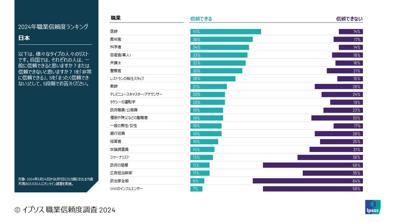 日本では、医師(41%)、裁判官(36%)、科学者(34%)が信頼できる職業トップ3です。一般的に、最前線で働く公共サービスの従事者(軍隊や警察の職員を含む)は信頼される傾向にあります。