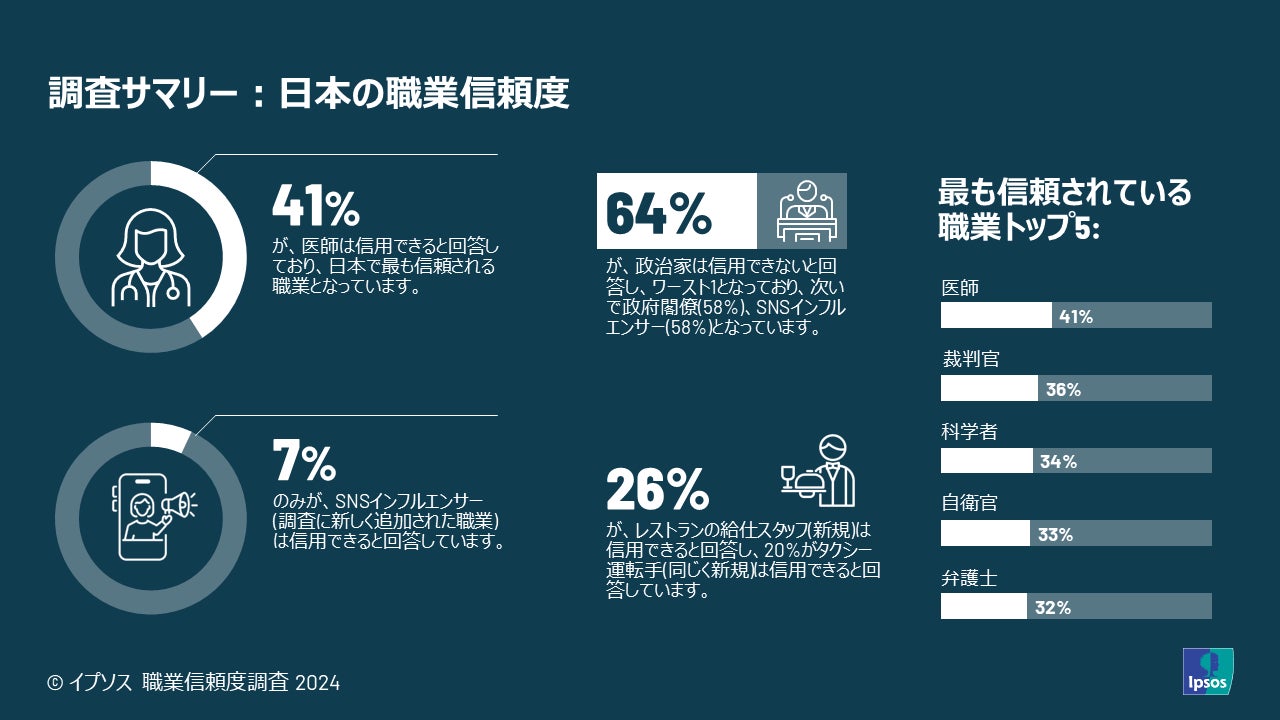 世界最大規模の世論調査会社イプソス株式会社(日本オフィス所在地:東京都港区、代表取締役:内田俊一)は、さまざまな職業に対する人々の信頼を調査した「イプソス職業信頼度調査2024」を発表しました。詳細のレポートはこちらからご確認ください。