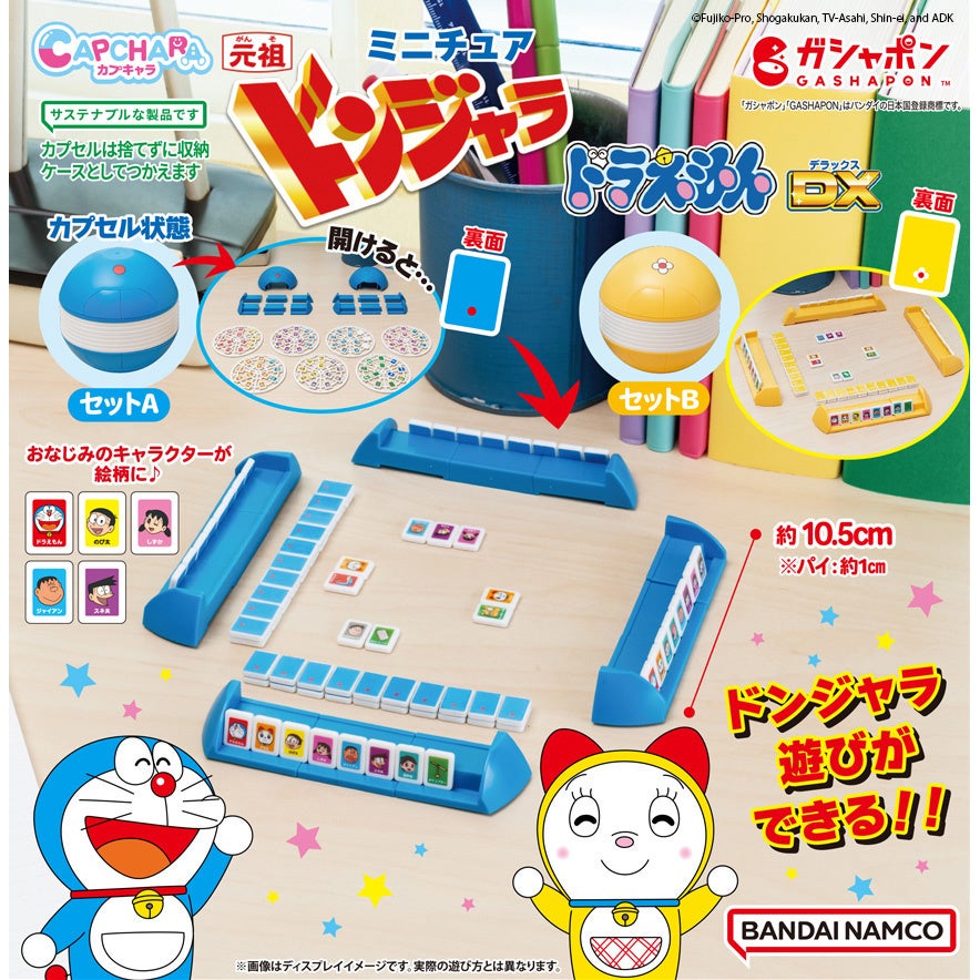 本商品は、『ドラえもん』の世界観を楽しみながら、キャラクターの“パイ”を集め、組み合わせることで点数を競う、ファミリーゲーム「ドンジャラ」の『元祖ドンジャラドラえもんDX』 をミニチュアサイズにし、カプセルに詰め込んだ商品です。