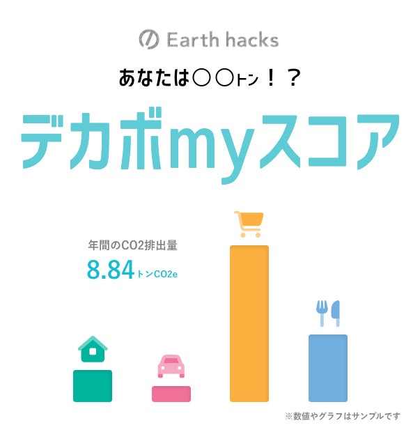 「デカボmyスコア」とは、生活者がライフスタイルの中で取る選択肢(移動手段、ショッピング、住居、食事)の4つの観点から、12問の簡単な質問に答えることで、個人の年間二酸化炭素相当排出量を算出できるEarth hacksが提供するソリューションです。