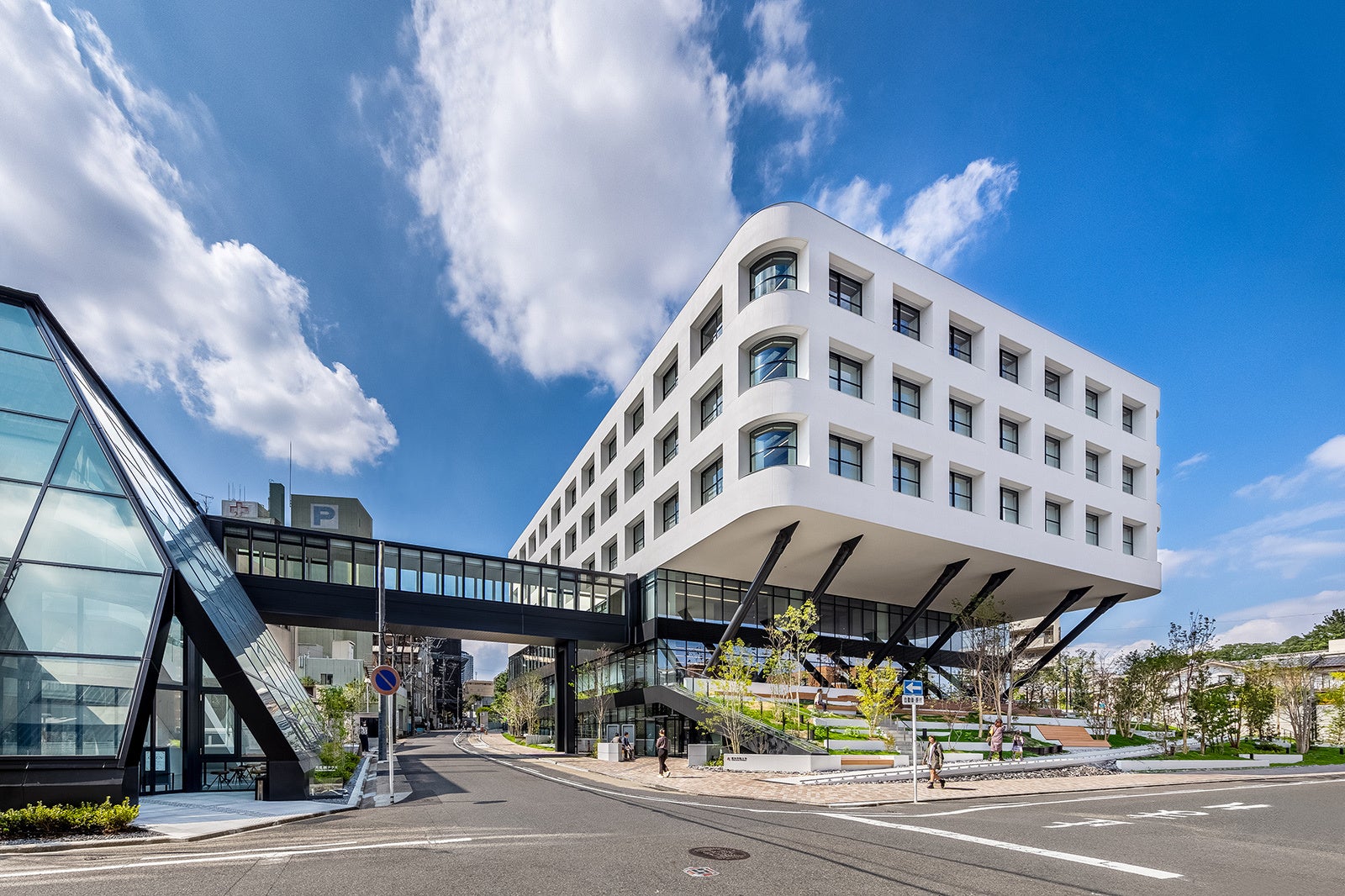 本計画の特徴である緑の丘のキャンパス広場は公開空地として地域住民の方も自由に利用でき、学生さんと地域社会の接点になっています。広場を登りきると建物2階にアクセスし、吹抜周りに学生の居場所・学習の場を持つラーニングステップにつながり、地域社会と大学機能が緩やかに連続する計画としました。