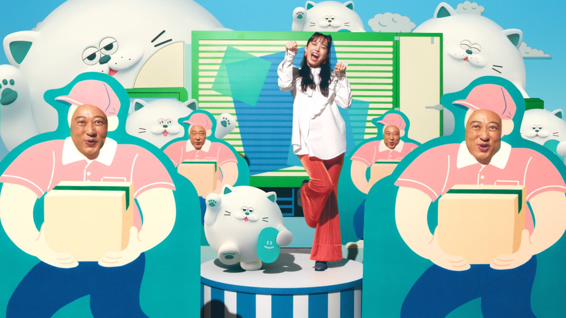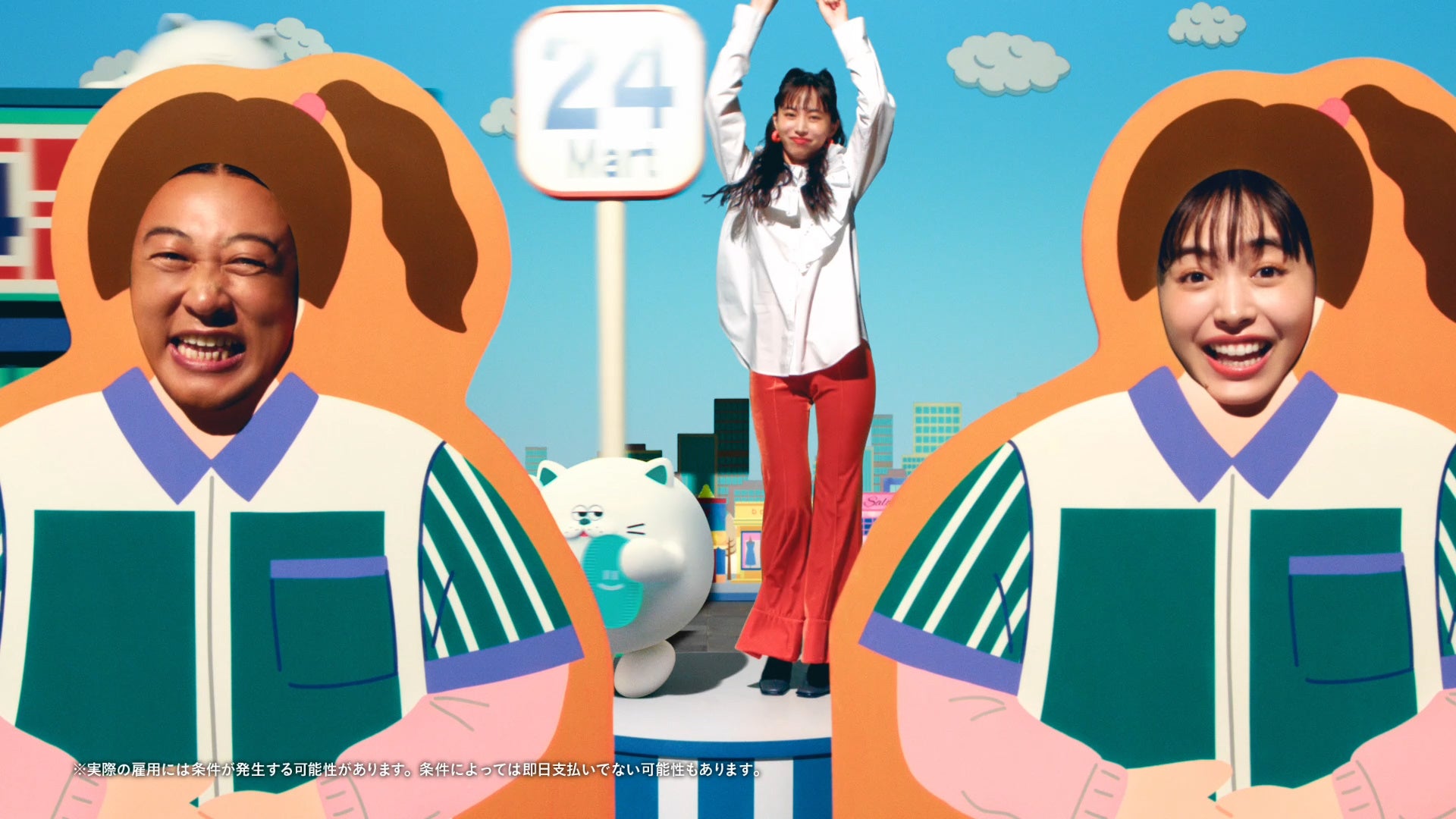 シェアフルを通してスキマバイトではたらく世界を「おいでよ!シェアフル」のキーフレーズとともに制作。音楽に乗せてまねきダンスを踊る、井桁弘恵さんとマスコットキャラクターの「すきまろ」。多業種にスキマバイトする姿を、ロバート秋山竜次さんが顔はめパネルを使って表現しています。