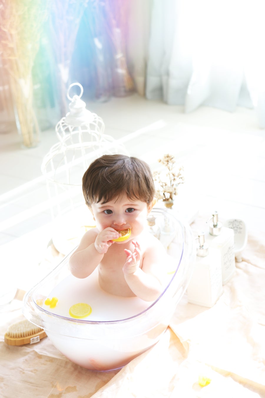 神奈川県川崎市、ライフスタジオ新百合ヶ丘店では1歳の記念を機会にご来店いただく多くの皆様に撮影をより楽しんでいただき素敵な時間になるようにと願いを込めて、ミルクバス撮影を行っております。