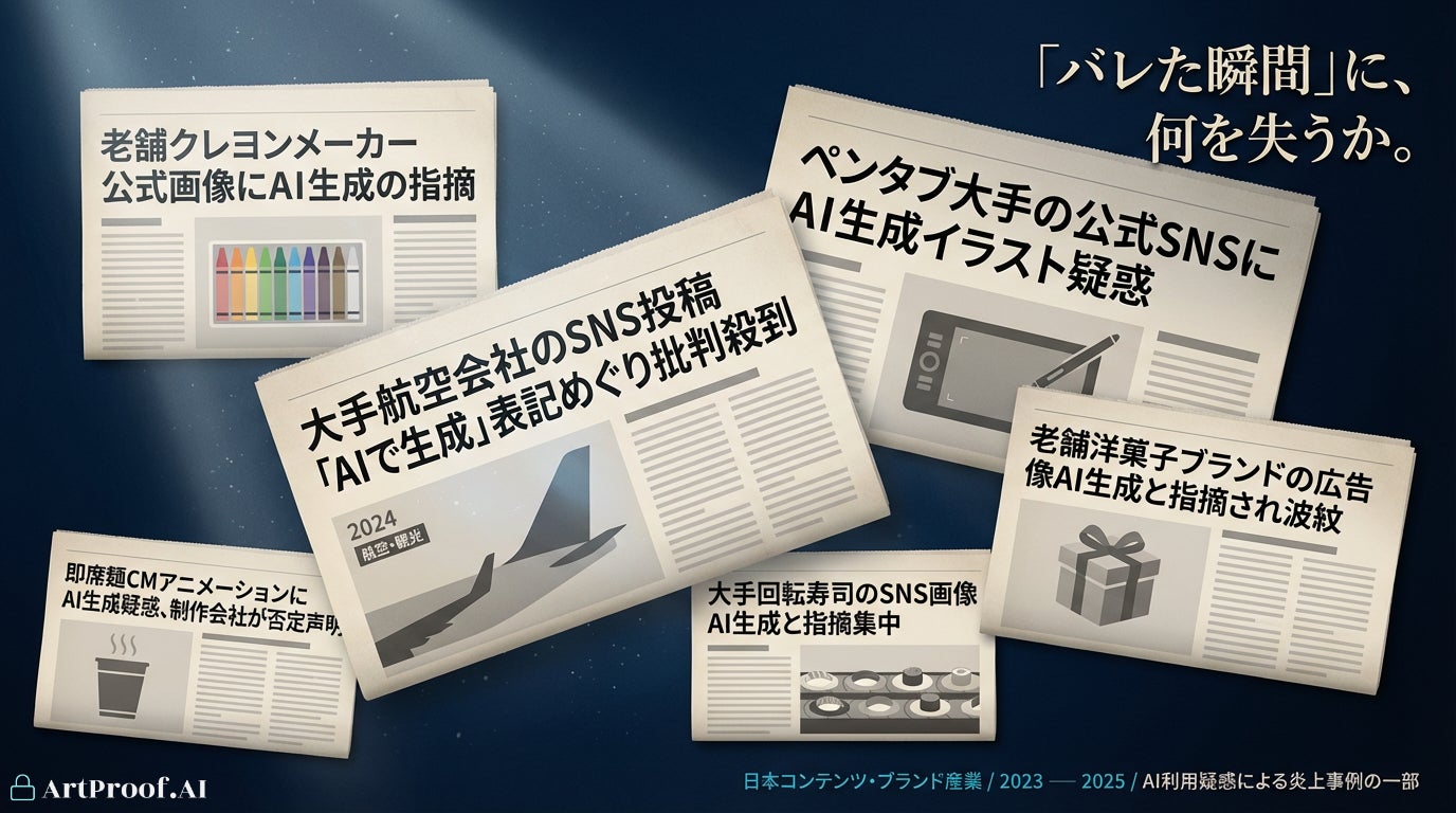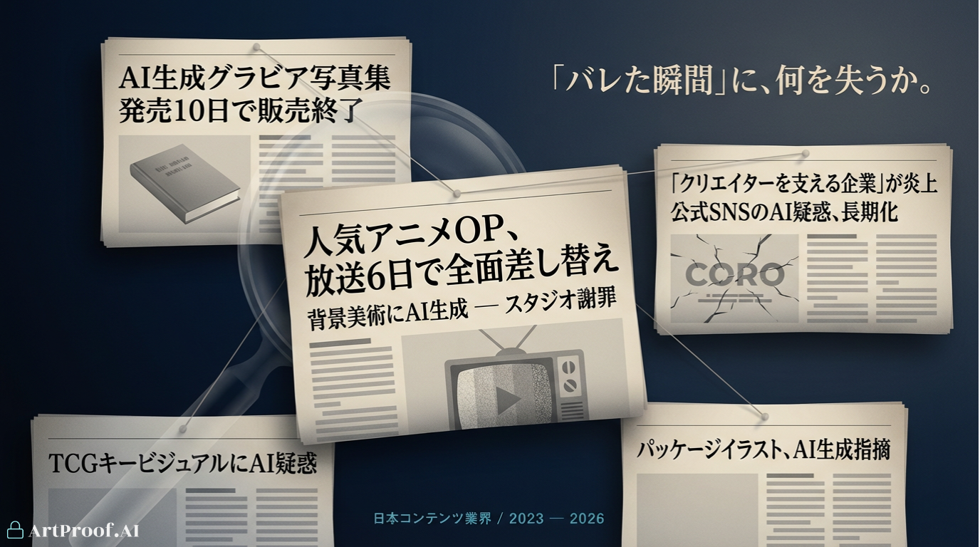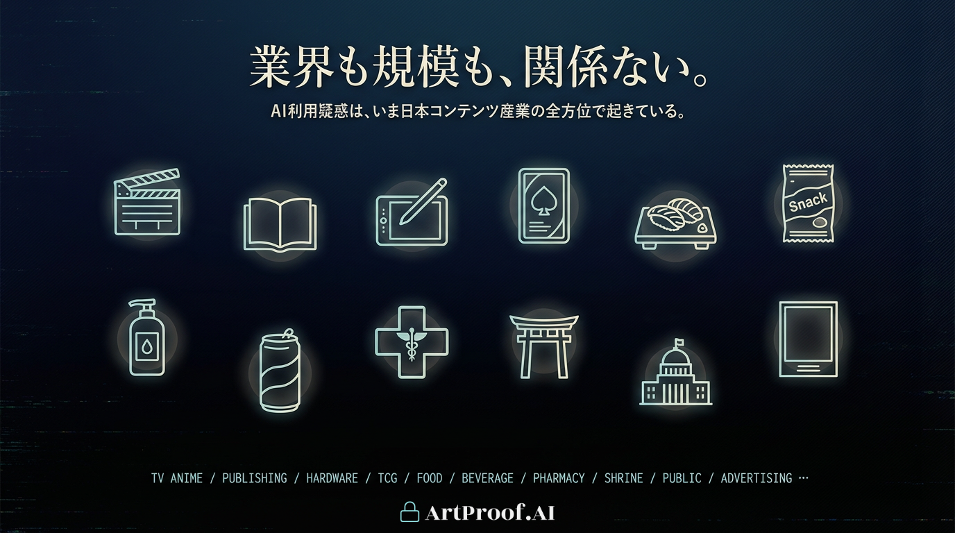 これら以外にも、人気TVアニメシリーズの新OP映像が放送開始からわずか6日後にSNSで背景美術へのAI生成利用を指摘され全面差し替えに追い込まれた事例(*4)、大手出版社のAI生成グラビア写真集が発売10日で販売中止となった事例(*4)、さらにトレーディングカードゲームのキービジュアル、菓子・入浴剤のパッケージイラスト、清涼飲料のCMアニメーション、薬局チェーンの店頭物、神社の授与品、官公庁の啓発素材など(*4)──業界・規模・性質を問わず、AI利用疑惑による炎上は日本コンテンツ・ブランド産業の全方位で発生しています。