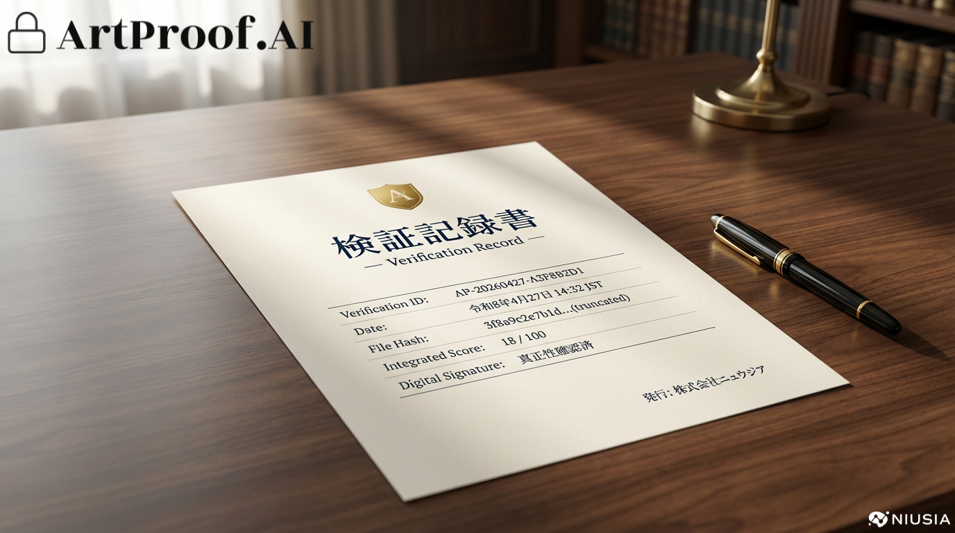 ArtProofが現在発行する検証記録書(Verification Record)は、解析時点におけるスコア・判定・ファイルハッシュを客観的に記録するPDF文書です。改竄検知ハッシュと電子署名付きで、社内QAの履歴管理・取引先への納品参考資料に利用できます。