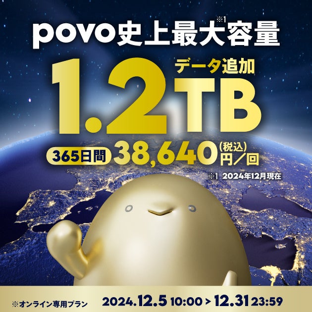 povo、史上最大容量の「1.2TB(365日間)38,160円」など1年間トッピング4種を期間限定提供