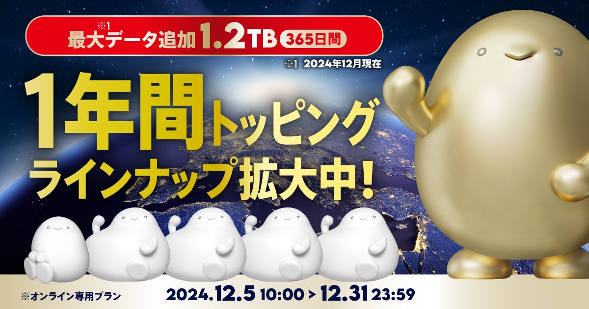 KDDI、沖縄セルラーは2024年12月5日から、povo2.0の1年間トッピングとして、povo史上最大容量の1.2TB(100GB/月相当)に加え、180GB(15GB/月相当)、48GB(4GB/月相当)、12GB(1GB/月相当)の計4種を期間限定で提供します。いずれも、1年間データ容量を柔軟に利用でき、時期によって利用量に変動があるお客さまも安心です。
