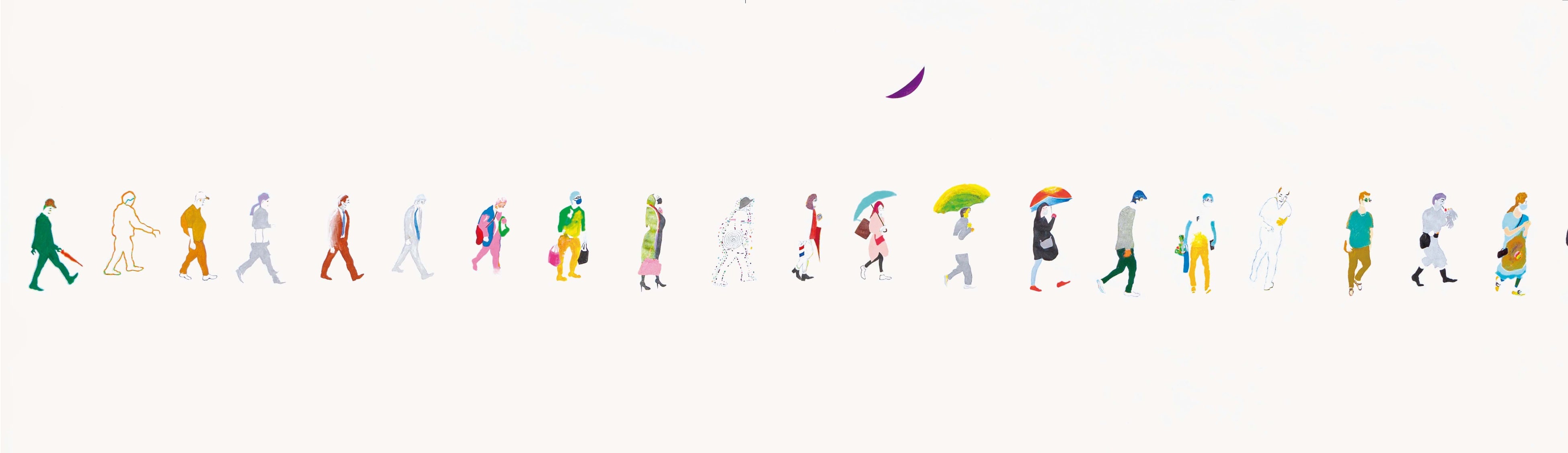 馬場の代表作ともいえる、17メートルの長さで描かれた、《街ゆく人々》という作品も圧巻です。本書の装幀にも掲載した作品で、馬場の個展では、画廊の壁面をぐるりと一周するように展示され、ここでもとても小さく描かれたたくさんの人物が、一人ずつ、丁寧に描かれています。それは学校帰りの学生やサラリーマン、ぼーっとして歩く誰かであったり、傘を手にしたり楽器を運んだりもする、色んな、普通の「ひとびと」です。ただよく見ると、やはり消えゆく人々なのです。私たちの儚い時間をいとしく思い、偶然の今をまぶしく見つめる、馬場のまなざしを感じます。