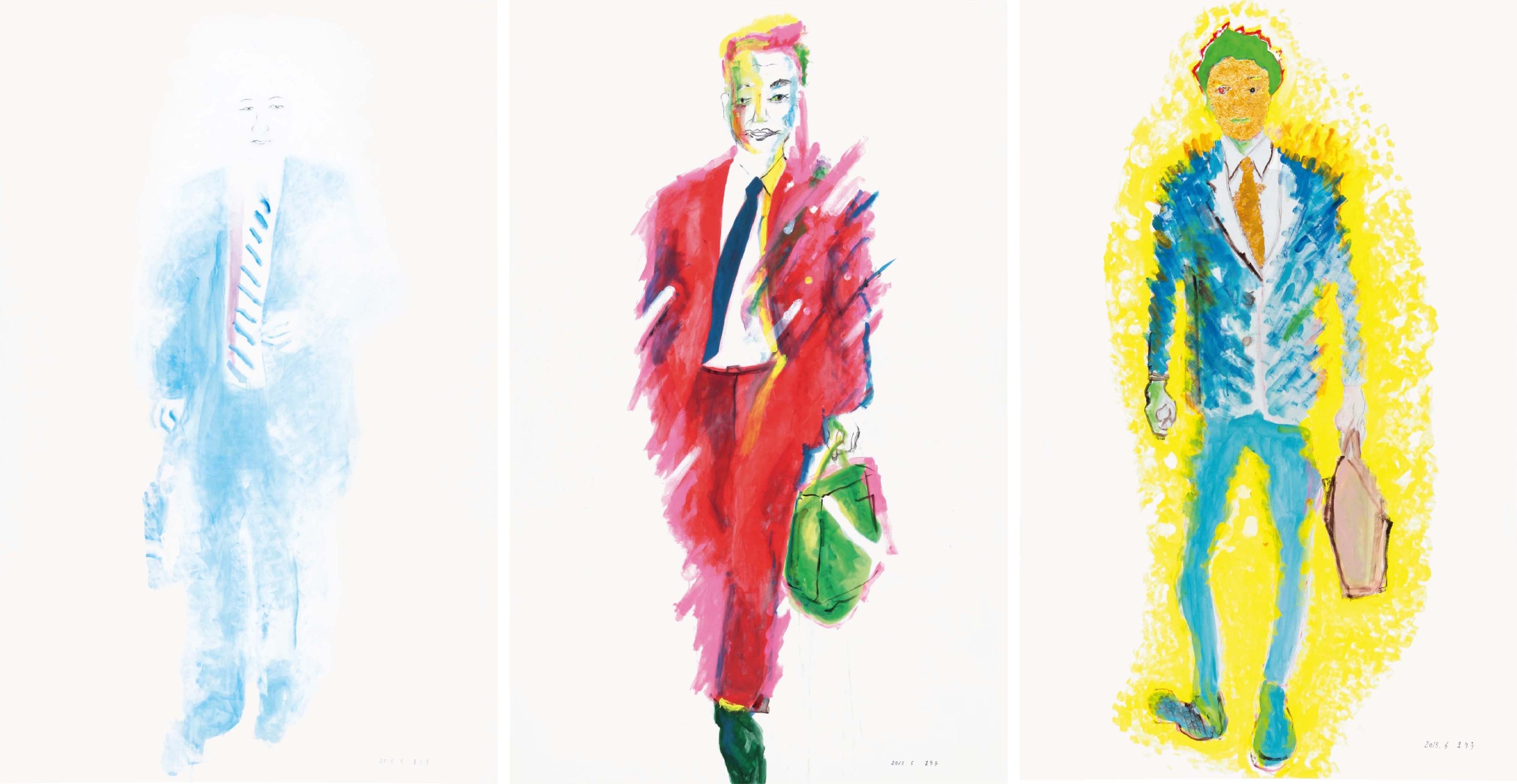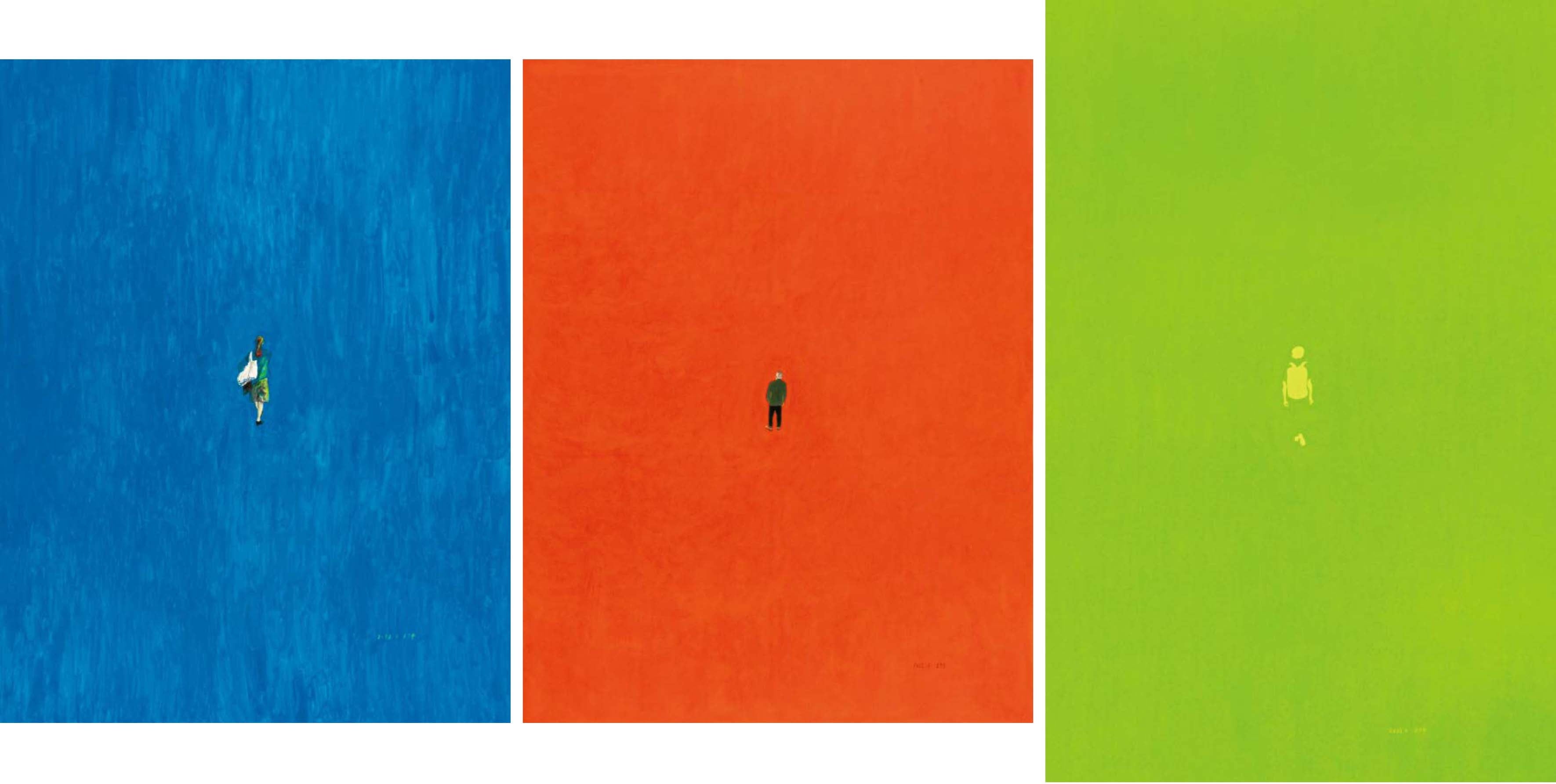 2021年に入り、馬場の創作はさらに変化します。2メートルを越えるパネルに塗り敷かれたような色彩のなかに、不自然なほど小さく描かれた「ひと」が歩いています。また、肩に掛けた鞄と手荷物などでかろうじて存在の分かる、透明人間のような「ひと」。やがて背景の色のなかに溶け込んでしまい、見るのも困難な「ひと」も登場します。描くたびに見えなくなっていくその姿に、なにか切実なものを感じてしまう、消えゆく「ひとびと」のシリーズが展開していきます。