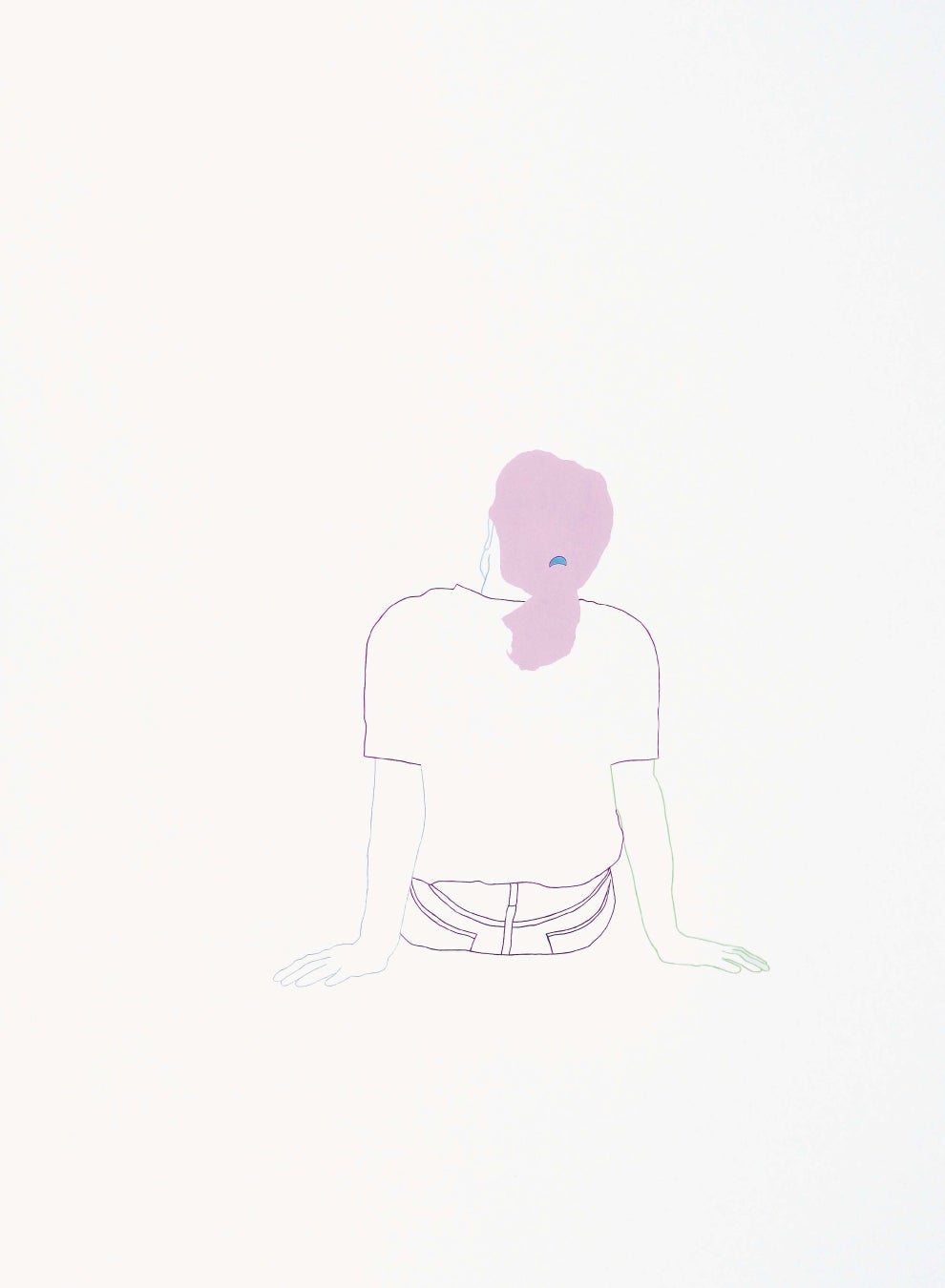 馬場まり子が描く「ひとびと」は、背景の余白のなかに半分溶け込んだような、淡い存在として画面に存在しています。地面の不在と、半ば透けるような「ひとびと」が醸す、ゆらぎのような空気が「人間社会」という圧を感じさせず、描かれた人たちには、ぼんやりとした幸福感が滲みます。そこには描き手による、人々への“いとおしさ”が重なっています。
