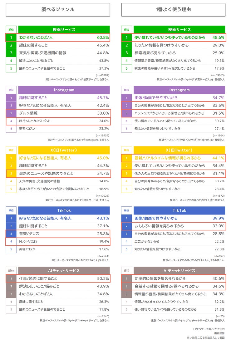 次に、それぞれのサービスで調べるジャンルやその中で一番使っているサービスを使う理由などを聞きました。「検索サービス※2」「X(旧Twitter)」「Instagram」「TikTok」「AIチャットサービス※3」をピックアップして結果を見ていきます。