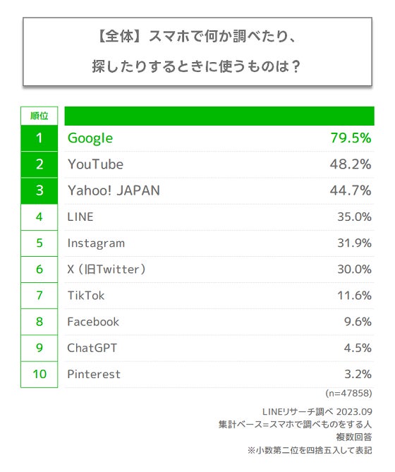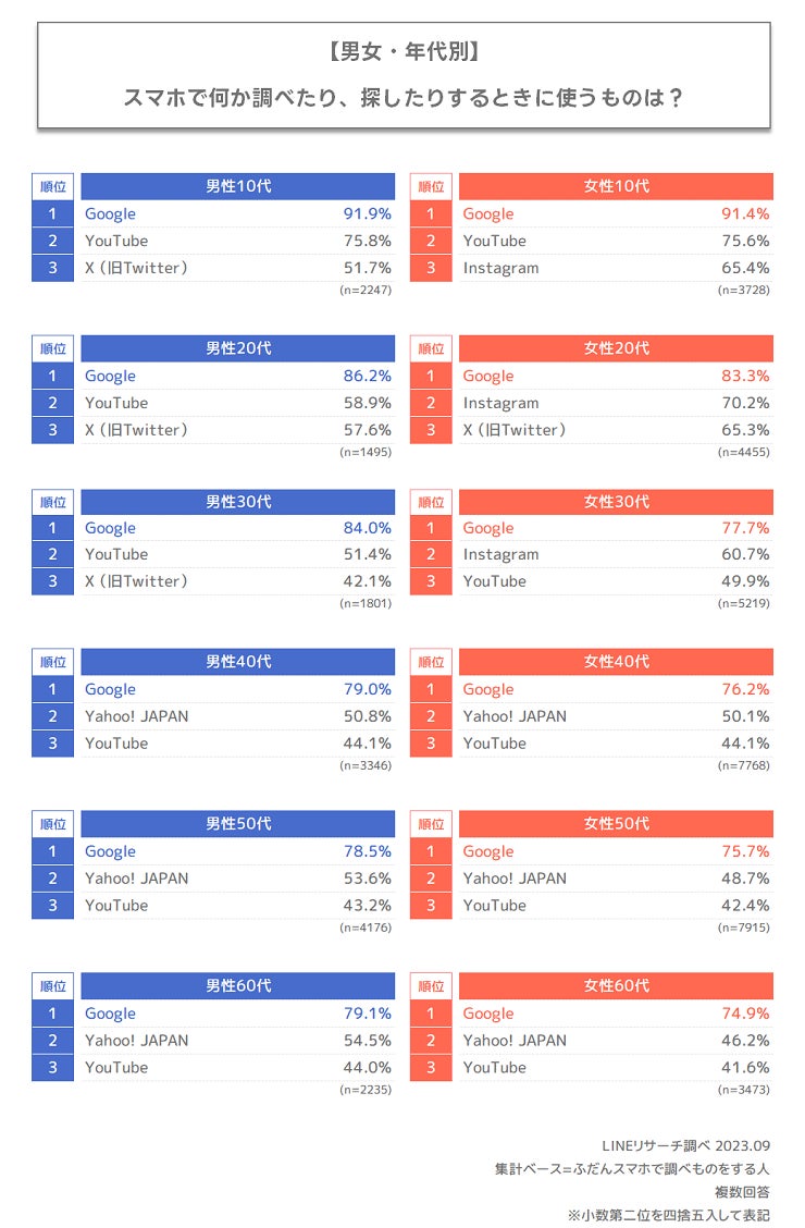 【LINEリサーチ】スマホで調べものをする際に使うもの1位は「Google」、女性20~30代では「Instagram」が2位に