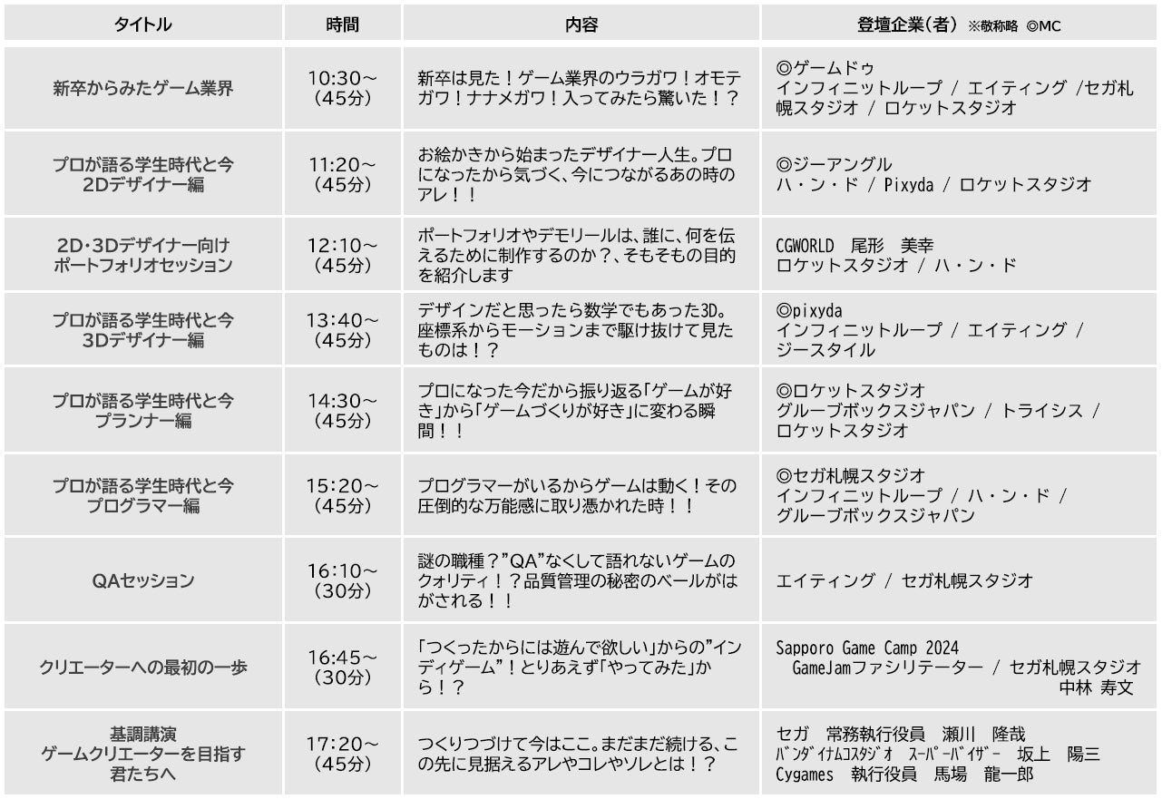 Sapporo Game Camp 2024 イベントプログラム ※詳細は公式サイト参照