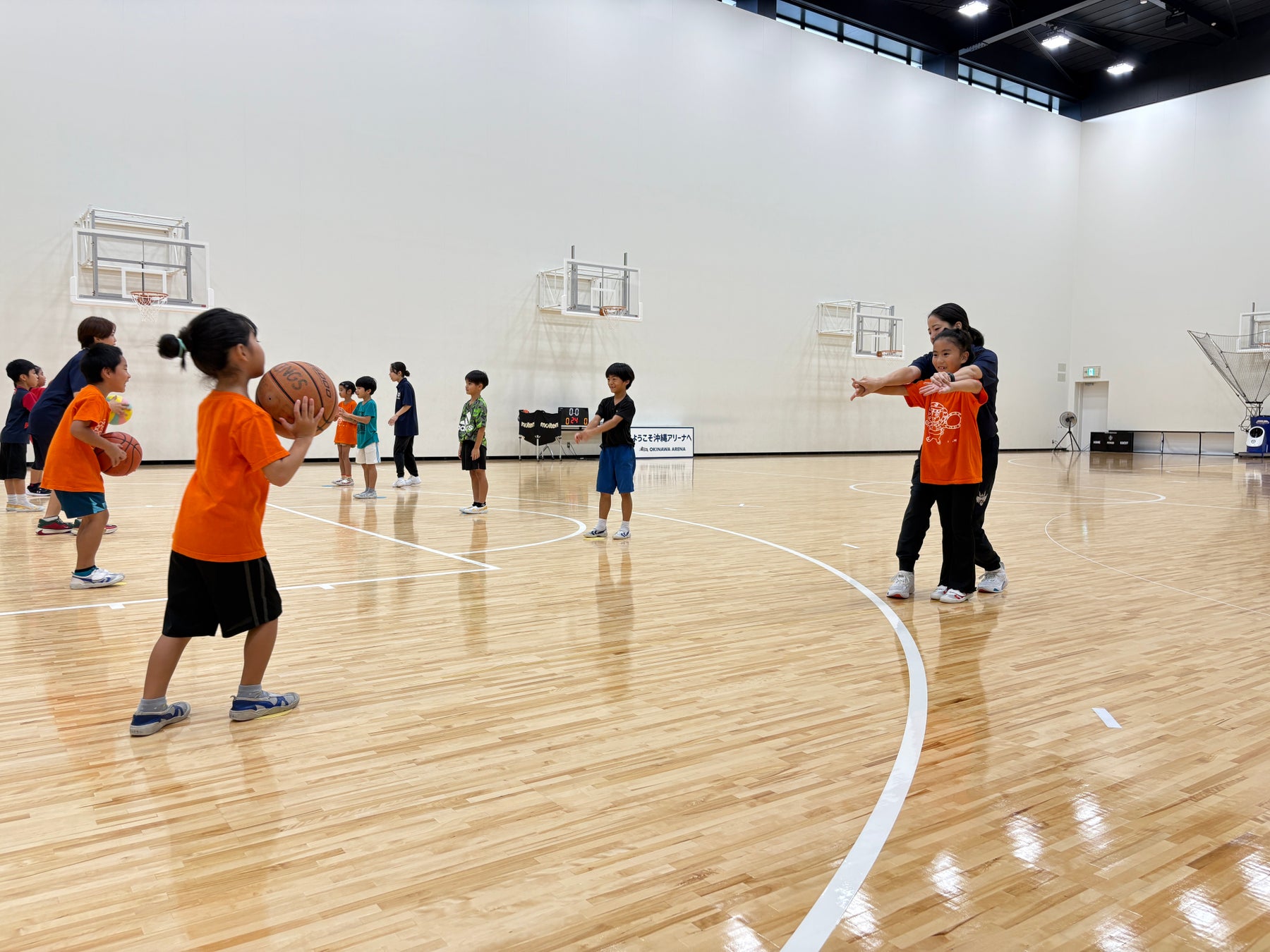 当日は「沖縄市福祉文化プラザ児童センター」から小学1年生9名にご参加いただきました。また、沖縄バスケットボール株式会社からキングスアカデミーのコーチが指導にあたったほか、沖縄アリーナ株式会社からは島袋裕樹が参加しました。