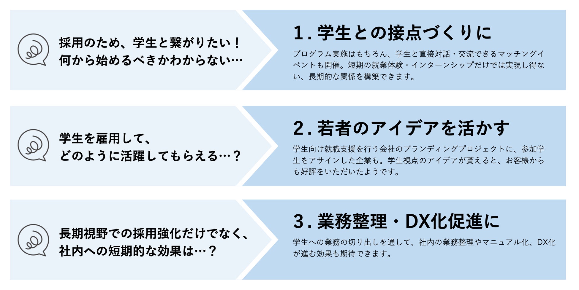 長期有給就業体験・インターンシップを初めて実施される企業はもちろん、学生のニーズに合わせてプログラムを見直したい企業の皆様まで、各企業の状況に寄り添う内容となっております。