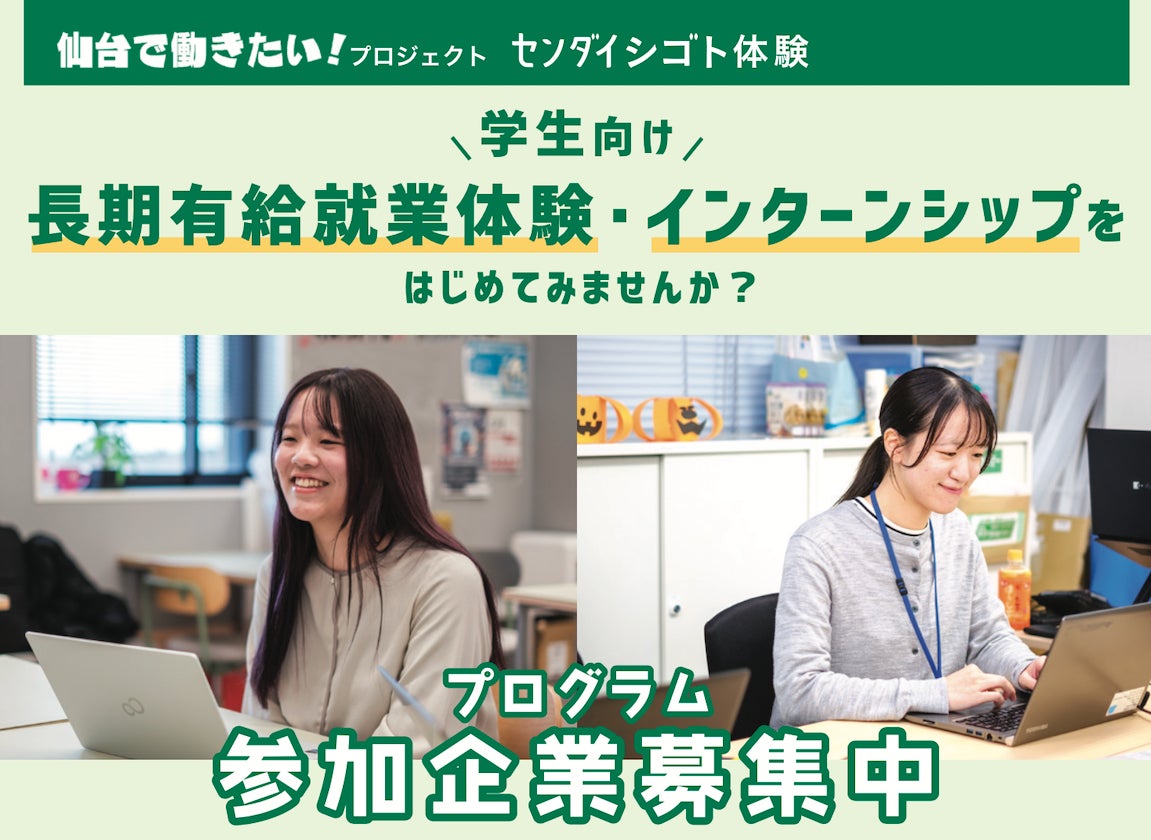 仙台市(運営:株式会社Asian Bridge)では、大学等低学年を対象とした地域企業での長期有給就業体験・インターンシップ「センダイシゴト体験」を、昨年度に引き続き今年度も実施いたします。