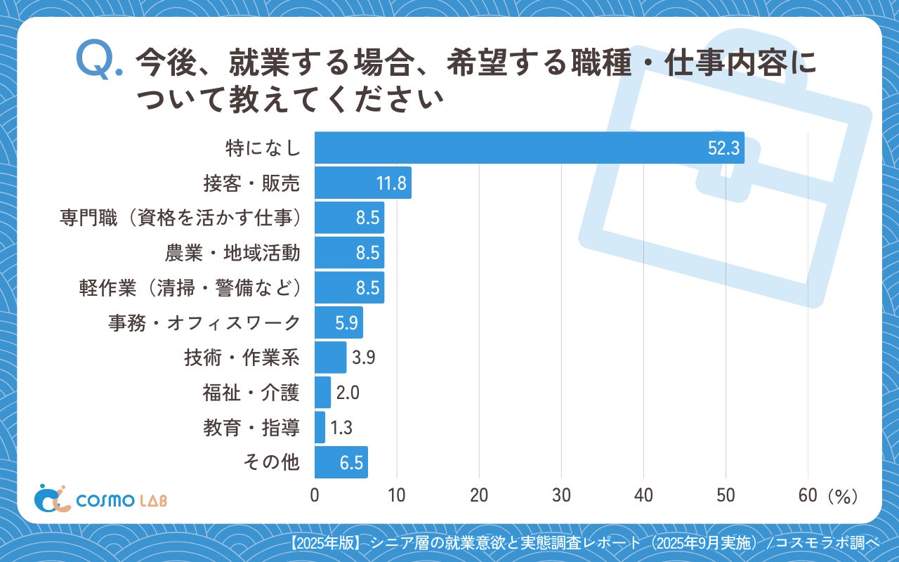 「農業・地域活動」(9.6%)や「軽作業(清掃・警備など)」(8.0%)も一定数を占め、地域社会に根ざした職務や高齢者でも可能な定型作業が主要な受け皿になっています。