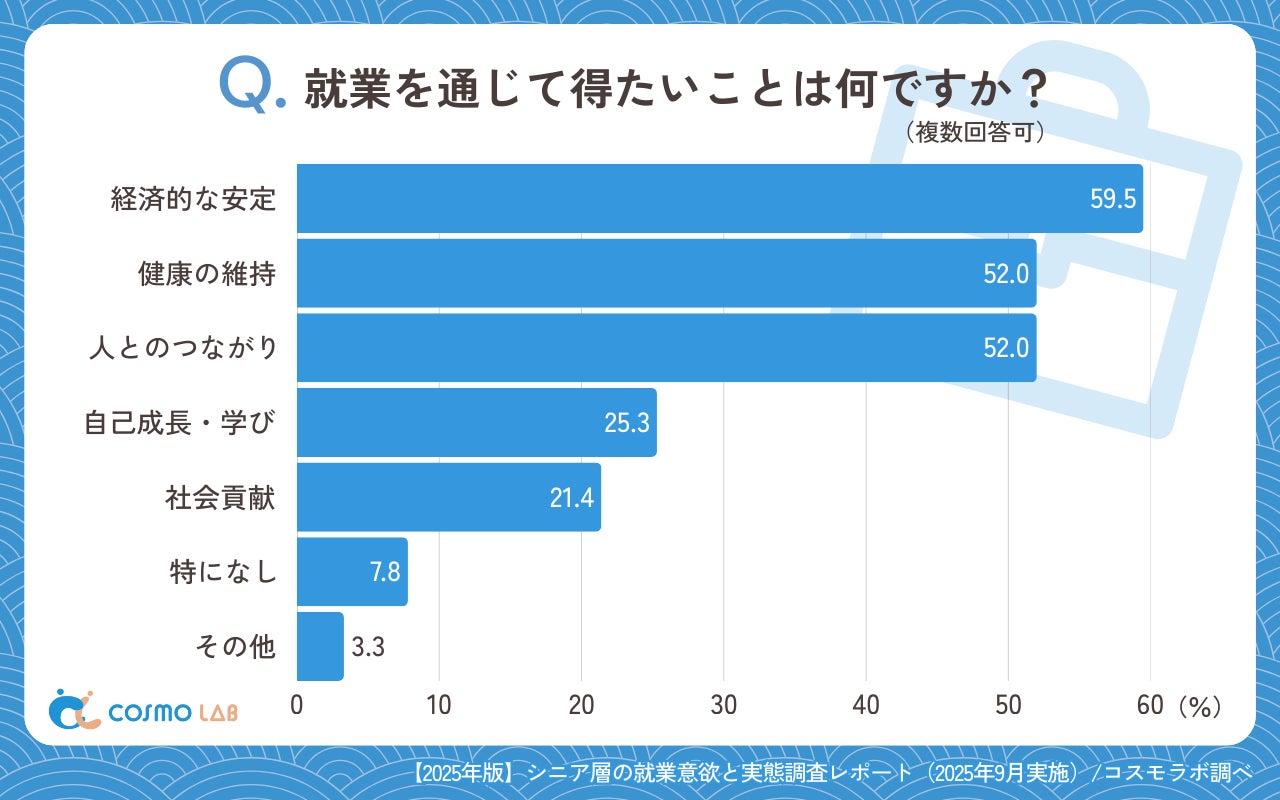 「経済的な安定」(59.5%)が最多で、「健康の維持」(52.0%)、「人とのつながり」(52.0%)が同水準で続きました。「自己成長・学び」(25.3%)や「社会貢献」(21.4%)も一定数を占めており、シニアが就業に求める価値は多角的です。