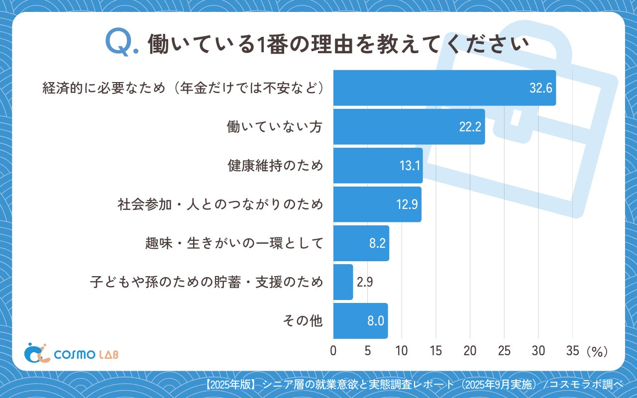 「経済的に必要なため(年金だけでは不安など)」(32.6%)が最多で、シニアの就業意欲を最も強く支えているのは経済要因でした。次いで、「健康維持のため」(13.1%)、「社会参加・人とのつながりのため」(12.9%)、「趣味・生きがいの一環として」(8.2%)が続きます。