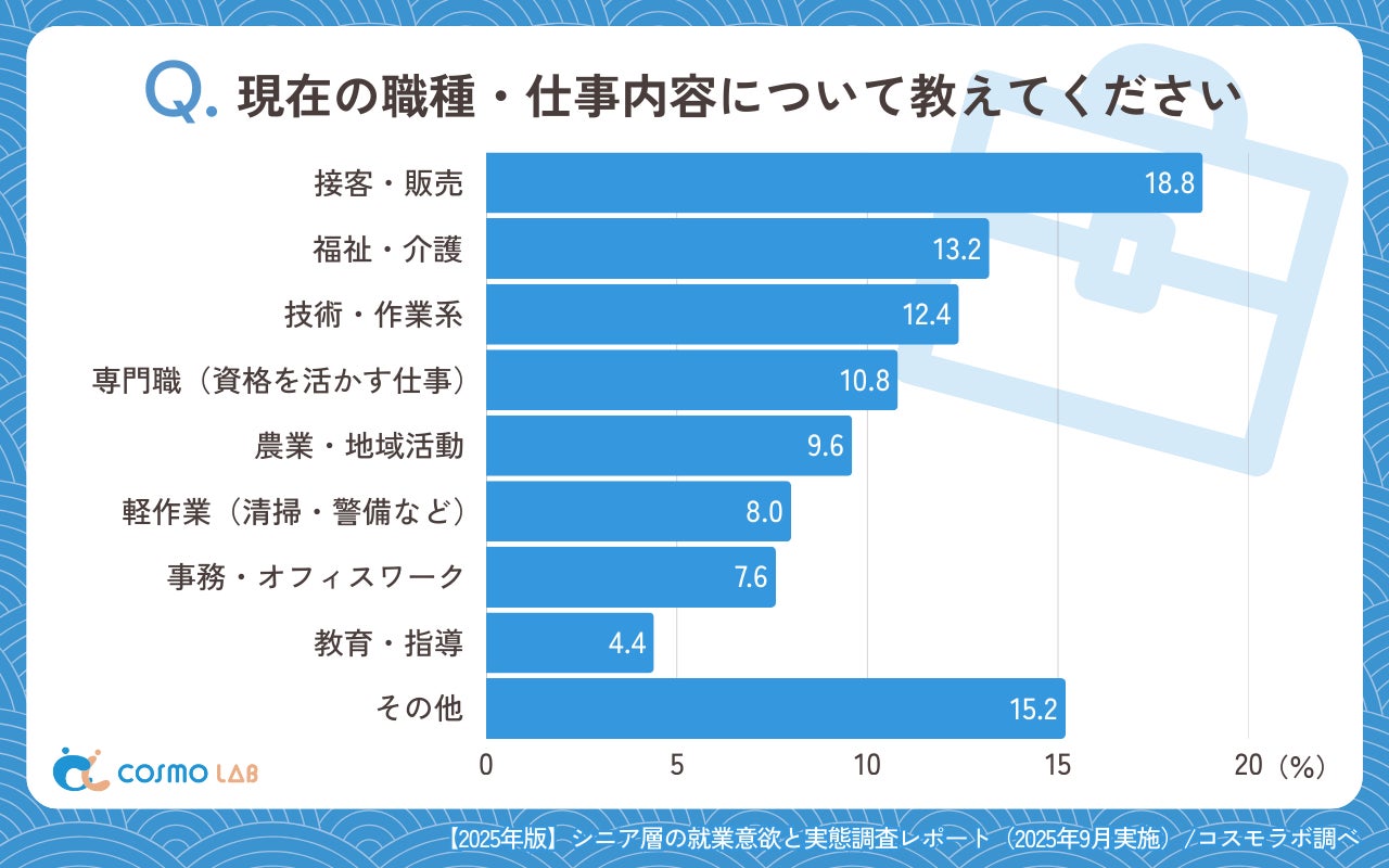 「接客・販売」(18.8%)が最多で、「福祉・介護」(13.2%)や、「技術・作業系」(12.4%)、「専門職(資格を活かす仕事)」(10.8%)が続きました。これらは経験を活かせる分野であり、身体的・対人スキルが重視される仕事が中心です。