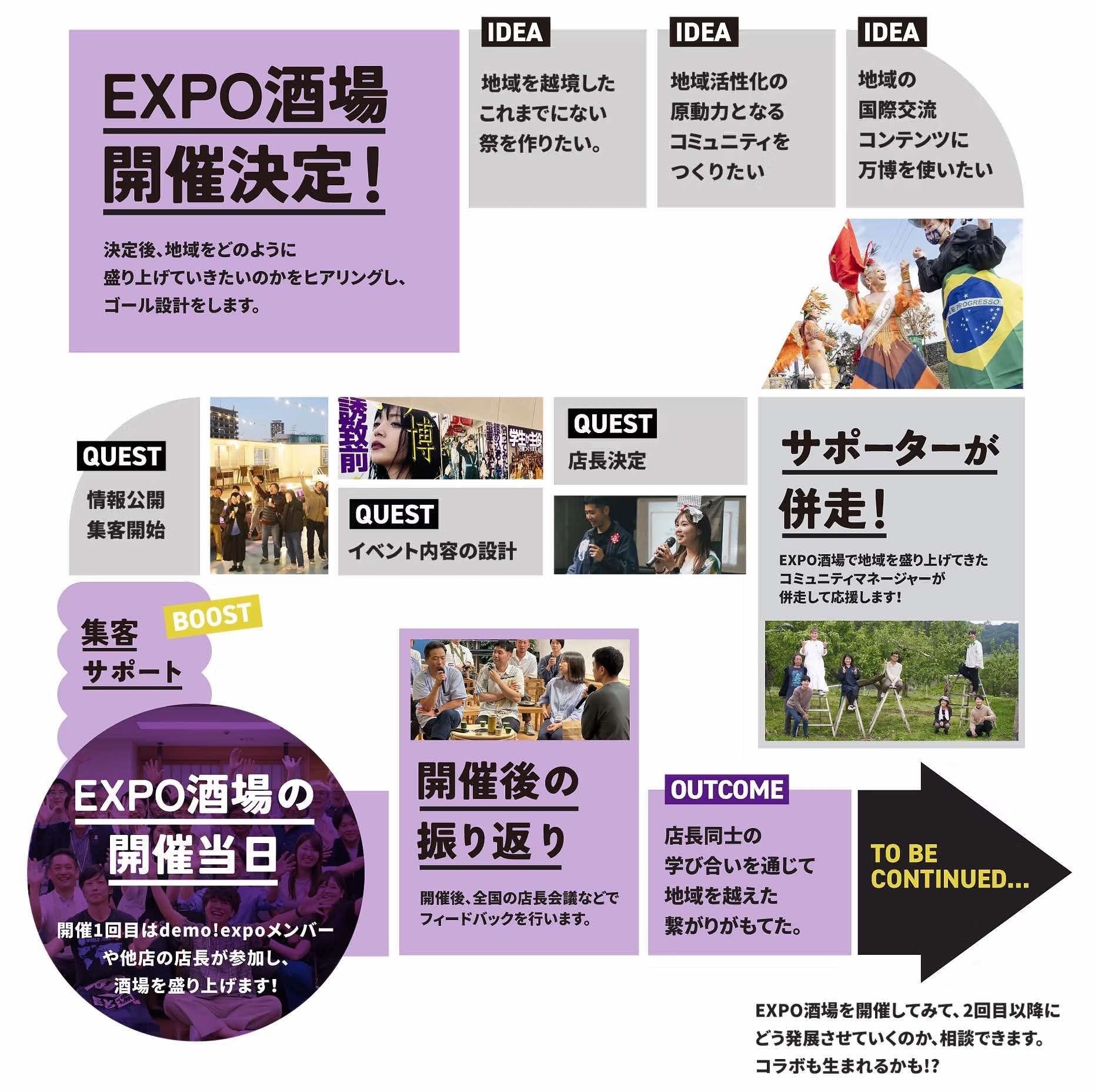 demo!expoは、各地域の想いに耳を傾けながら、どのように地域を盛り上げたいかを共に考え、EXPO酒場のゴール設計から開催、振り返りまでを伴走しています。