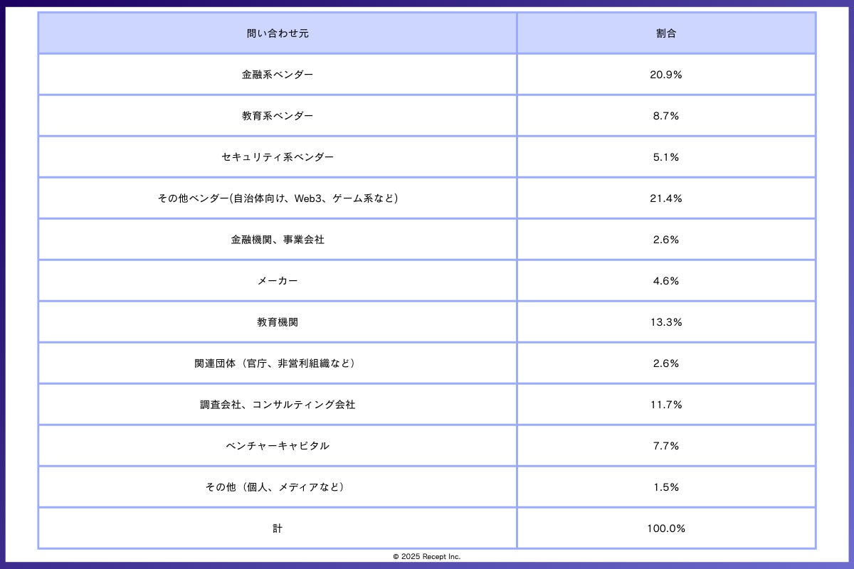株式会社 Recept(本社:東京都豊島区、代表取締役社長:中瀬 将健)は、DID/VC(Decentralized Identifier/Verifiable Credentials)技術に関して当社へ寄せられた問い合わせを対象にした企業分類調査を実施しましたので、その概要を公開します。