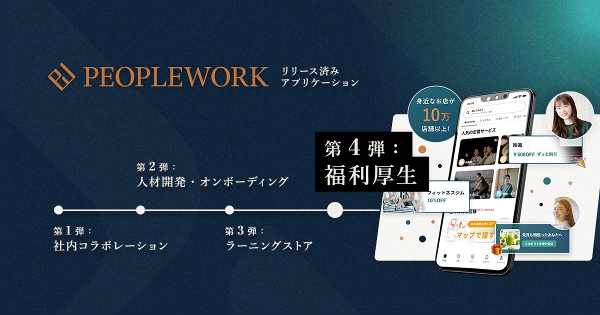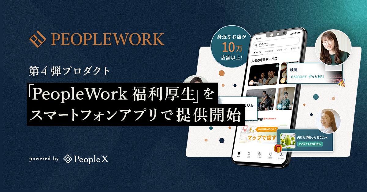 エンプロイーサクセス事業を推進する株式会社PeopleX(本社:東京都渋谷区、代表取締役CEO:橘 大地、以下:当社)は、「PeopleWork」の第4弾プロダクトとして、福利厚生アプリケーションの提供を開始いたします。「PeopleWork 福利厚生」はサービス導入企業の社員が10万店舗以上の飲食店やコンビニエンスストアなどをお得に利用できる福利厚生サービスです。専用のスマートフォンアプリを介することで簡単かつ日常的に福利厚生サービスを利用できるため、旧来の福利厚生サービスよりも高い利用率が見込まれ、社員のエンゲージメント向上や採用力の強化、離職率の低減に貢献します。