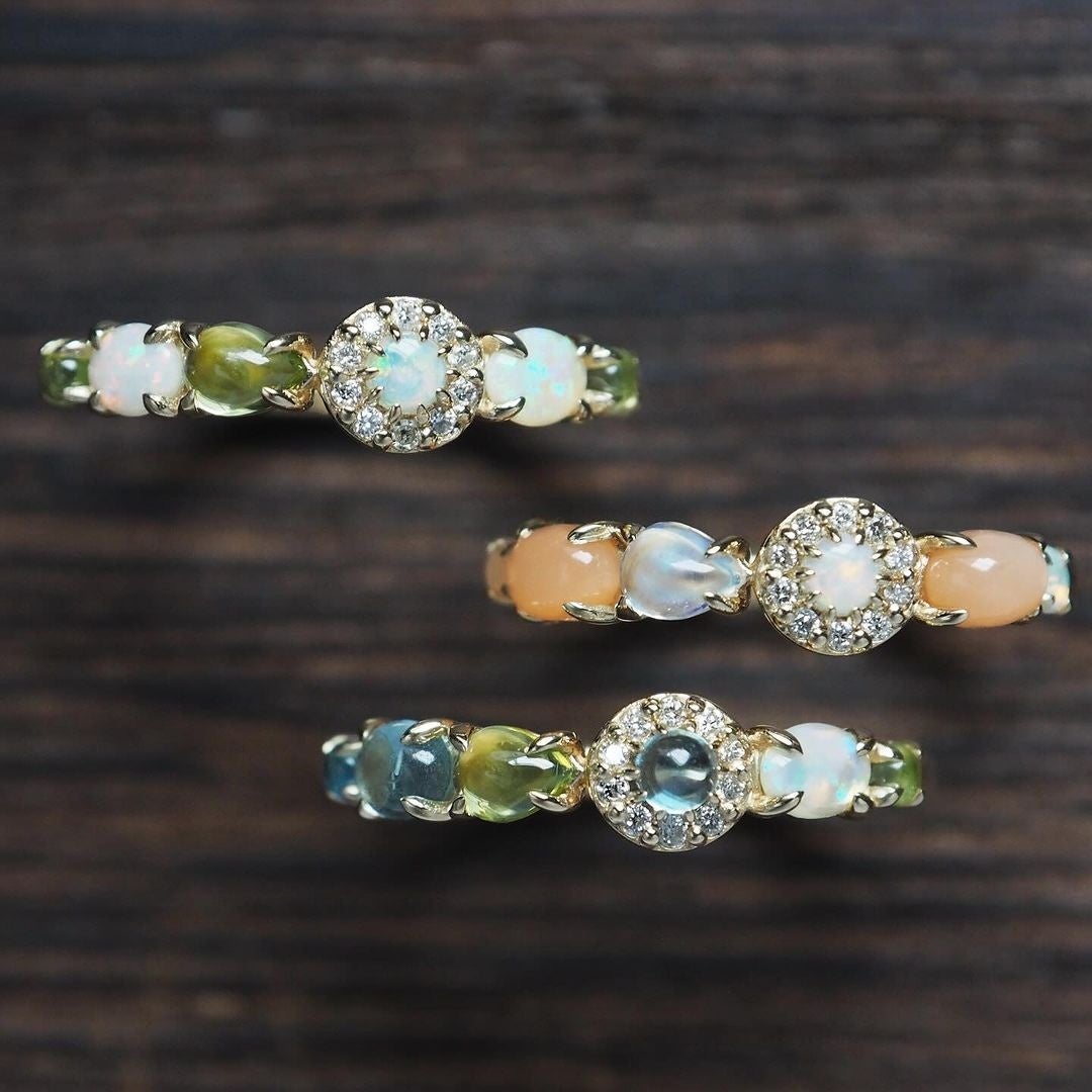 先日発表された『サンクルール』の新作がいよいよお目見えいたします。メインにはカボションカットの石をあしらいました。爪の工夫によりルースをしっかり支えながら、シャープなディテールが丸みや柔らかな印象を引き立てています。カボション特有の艶やかな色味とふっくらとしたフォルムが一層際立つデザイン。さらに、鮮やかで深みのある色合いに仕上げたアレンジや、乳白色のルースを使用した新たなアレンジも加わりました。これまでのサンクルールと重ね着けすれば、美しいコントラストをお楽しみいただけます。新作『サンクルール』税込91,300円より。いずれも現品限り。