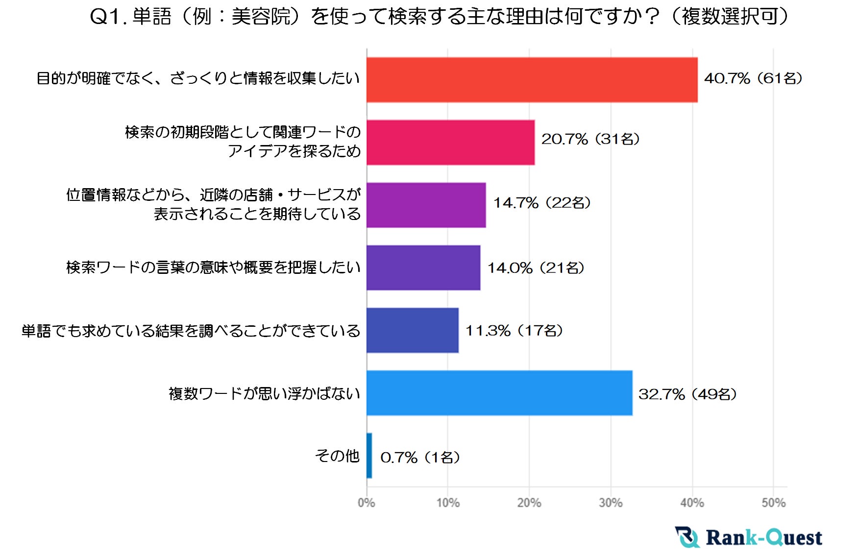 https://rank-quest.jp/column/column/how-to-seo/ 【SEO対策】で検索順位No1を獲得したランクエスト(注1)20代の「単語vs複数ワード検索」実態を調査