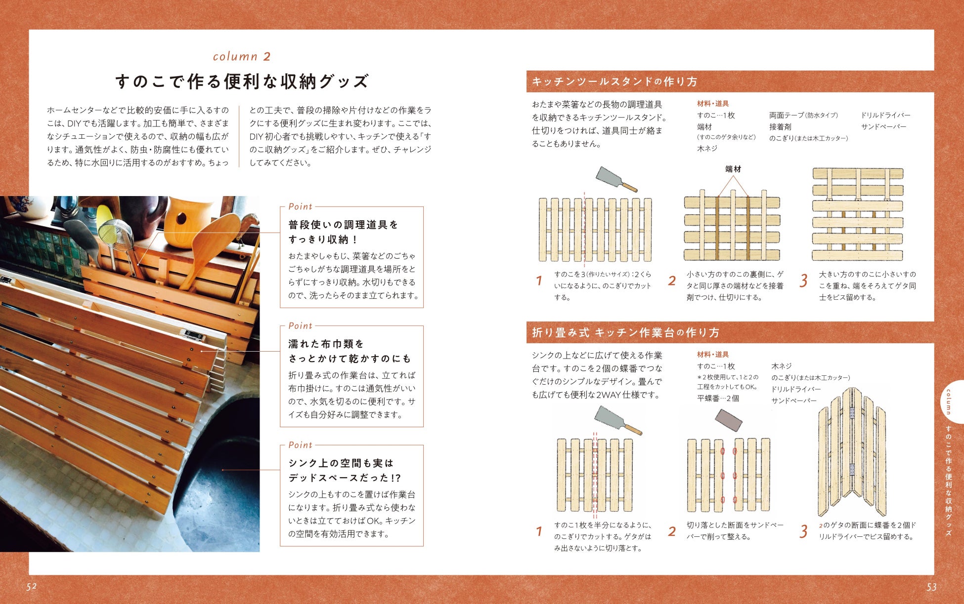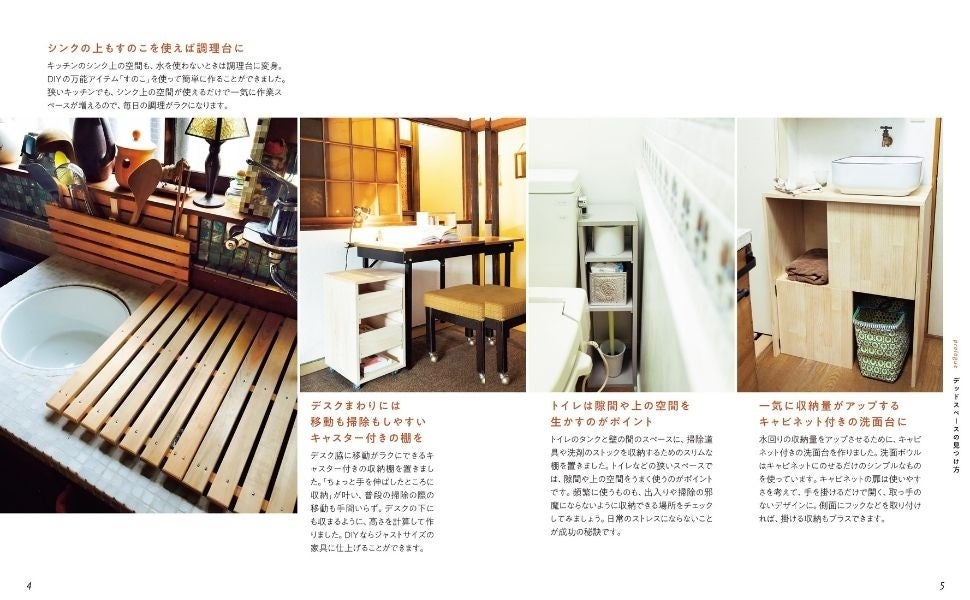 キッチンやトイレなど、視点を変えれば収納スペースは案外見つかるもの。それぞれの場所にあった収納アイテムの作り方をプロセス写真で解説。さらに、押し入れを活用するためのアイデア、テクニックを紹介!