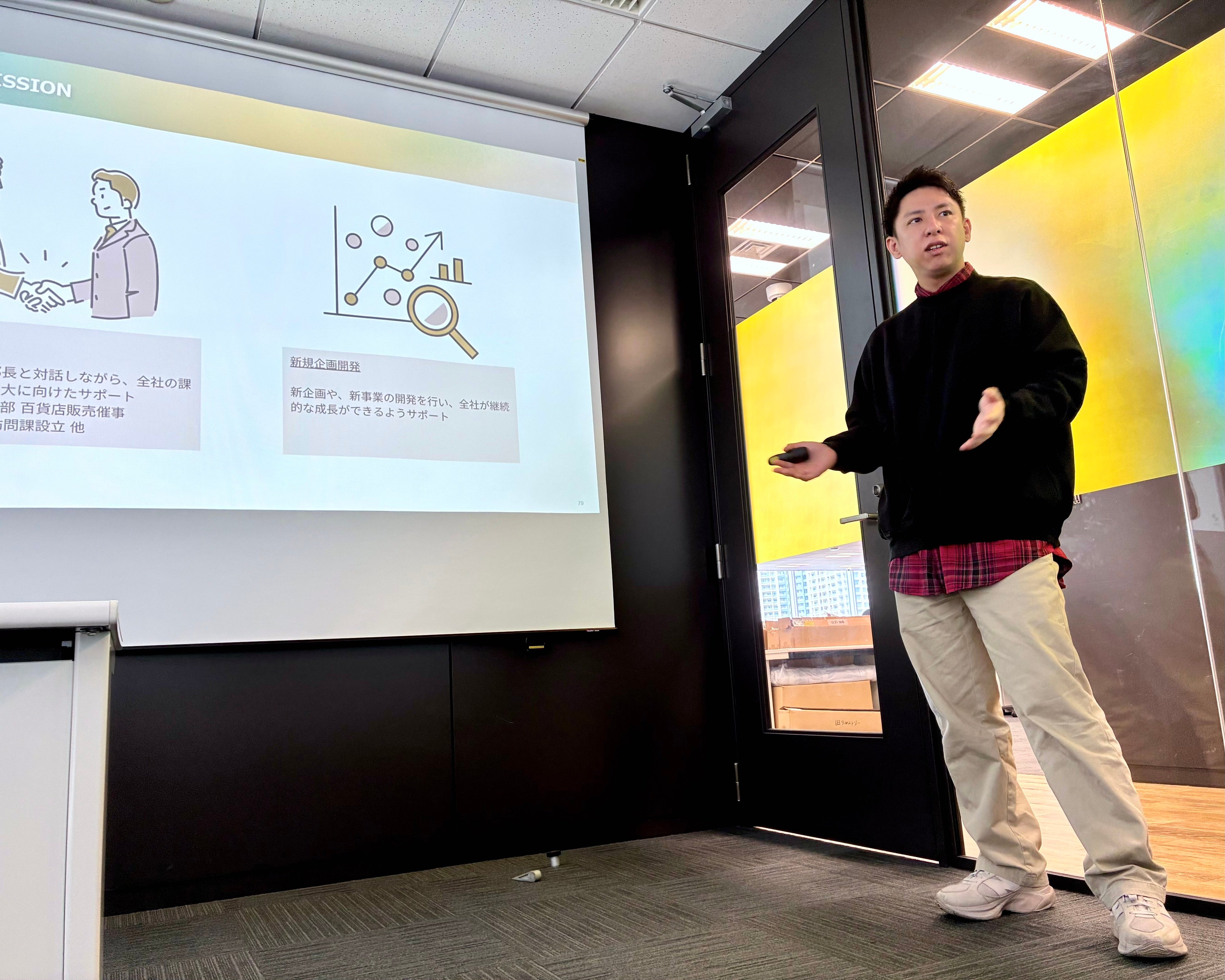まず、管理部より弊社の生い立ちやMVV、ブランドプロミス「想いによりそうパートナー(以下「想パ」)」などの会社説明をいたしました。また、部長陣から各部署の概要や各部のMVVに対する想いをご説明し、全社理解をより深めました。