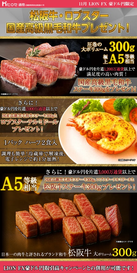 ヒロセ通商株式会社 (本社:大阪府西区、代表取締役:野市 裕作、以下:当社)は、当社の提供する「LION FX」において、2025年11月3日(月)より、「LION FX豪ドル円限定 松阪牛・ロブスター・国産高級黒毛和牛プレゼントキャンペーン」を実施することをお知らせいたします。