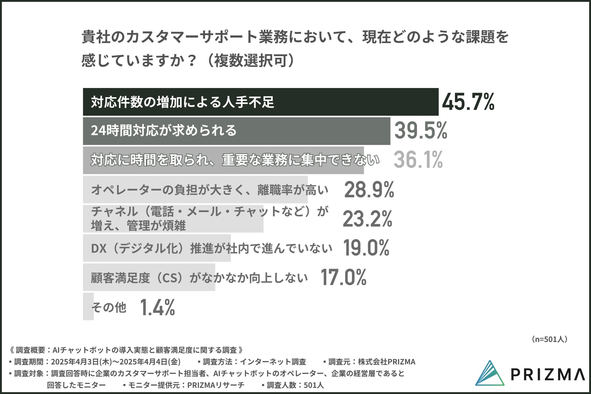 最も多かったのは『対応件数の増加による人手不足(45.7%)』という回答で、『24時間対応が求められる(39.5%)』『対応に時間を取られ、重要な業務に集中できない(36.1%)』といった声も多く挙がりました。