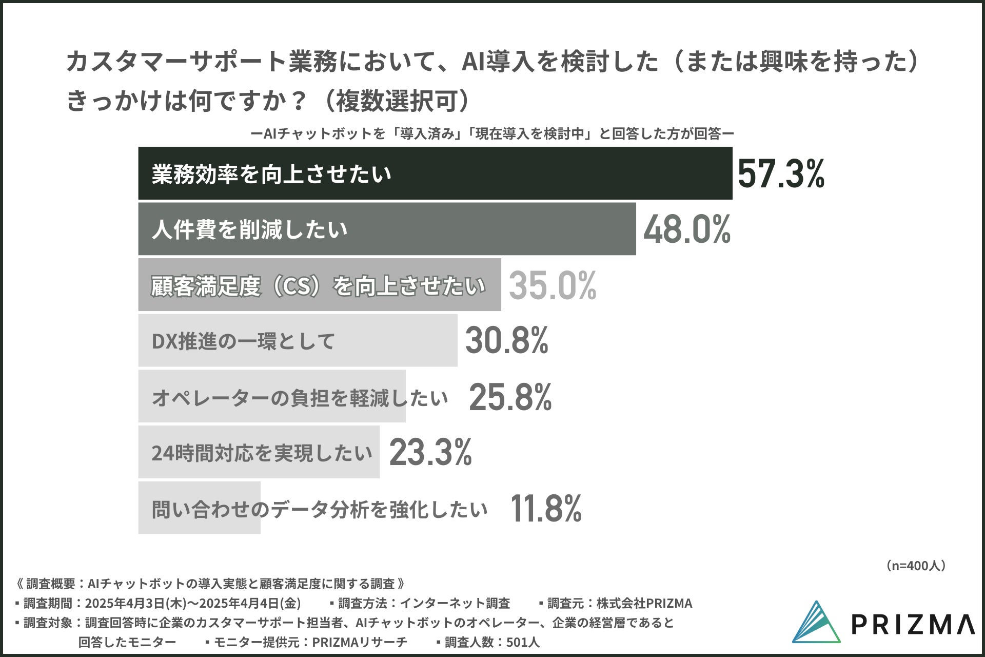 導入を検討したきっかけとしては、『業務効率を向上させたい(57.3%)』が最多で、次いで『人件費を削減したい(48.0%)』、『顧客満足度を向上させたい(35.0%)』といった理由が続きました。