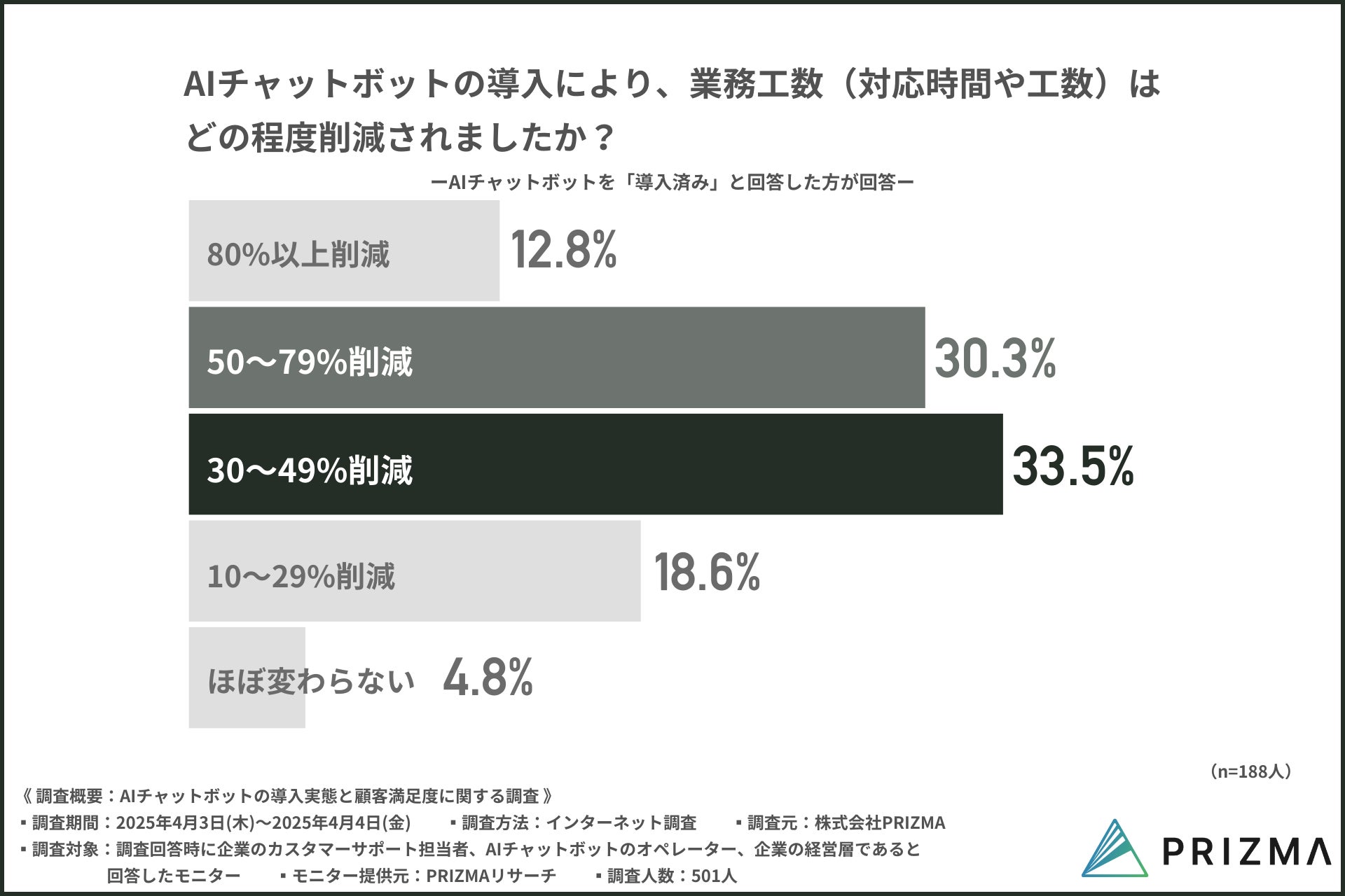 「業務工数(対応時間や作業負荷)がどの程度削減されたか」という質問では、『30〜49%削減(33.5%)』できたと回答した方が最も多く、次いで『50〜79%削減(30.3%)』と続きました。