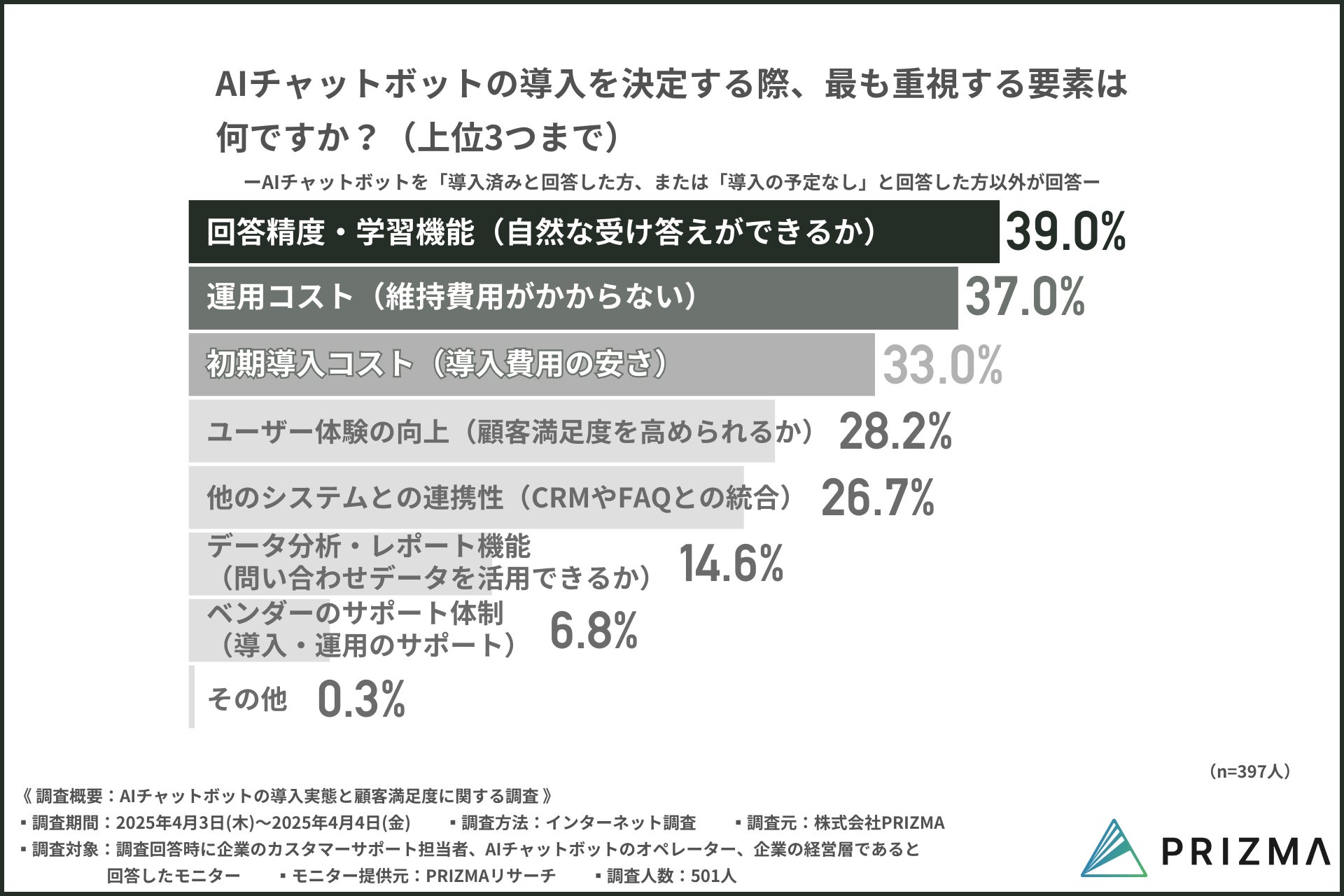 『回答精度・学習機能(自然な受け答えができるか)(39.0%)』が最も多く、次いで『運用コスト(維持費用がかからない)(37.0%)』『初期導入コスト(導入費用の安さ)(33.0%)』が続きました。