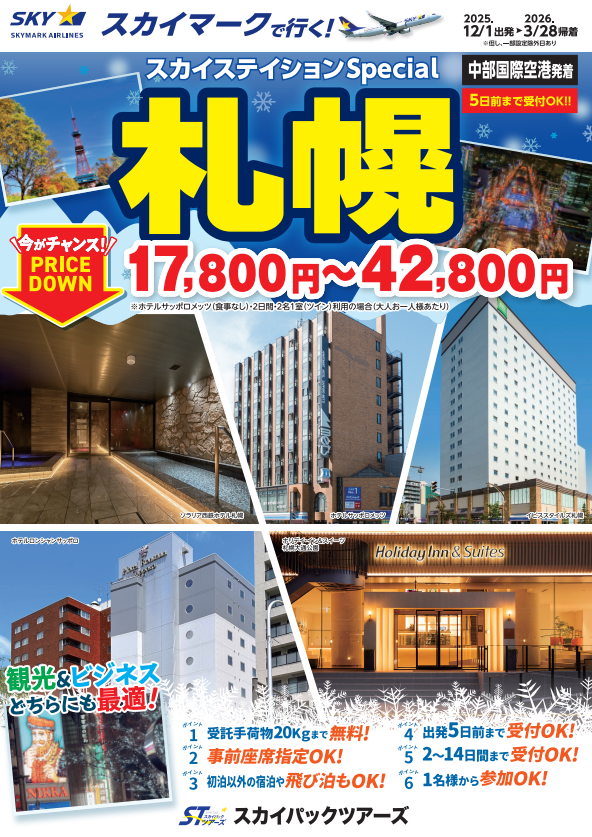 2025年12月19日出発~2026年3月28日帰着分のスカイマーク航空券とホテルがセットになった神戸空港就航20周年記念クーポンキャンペーンの販売開始しました!