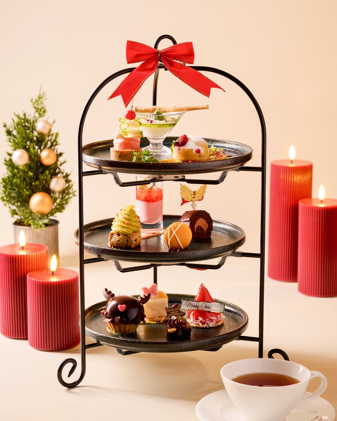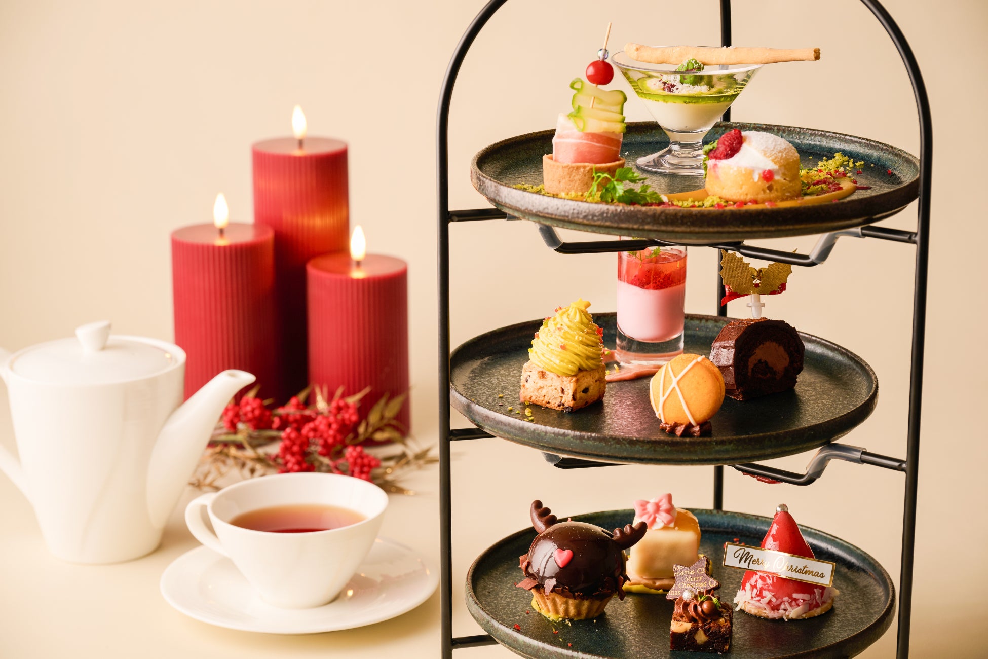 サンタの帽子やトナカイのタルトが並ぶ「クリスマスアフタヌーンティー」登場。3段のプレートで贈る、冬限定の華やかなティータイム。