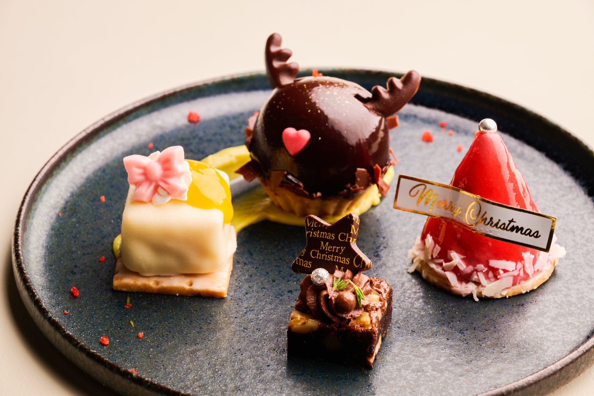 最後を飾るのは、クリスマスの主役たちが勢ぞろいしたペストリー。サンタの帽子を模した艶やかなフランボワーズムース、可愛らしいトナカイのチョコムースタルト、そしてプレゼント型のチーズケーキ。一口ごとに広がる“聖夜の物語”をお楽しみください。