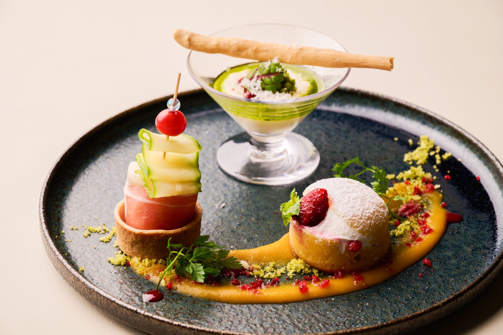 雪の森をイメージしたセイボリーでは、冬化粧をまとったフルーツサンドや、針葉樹を思わせるミニタルトなど、見た目も楽しい一品だけでなく、仕上げには、目の前でパルメジャーノを削り落とす“粉雪”の演出を。香りとともに立ちのぼるチーズの余韻が、冬の訪れを感じさせます。