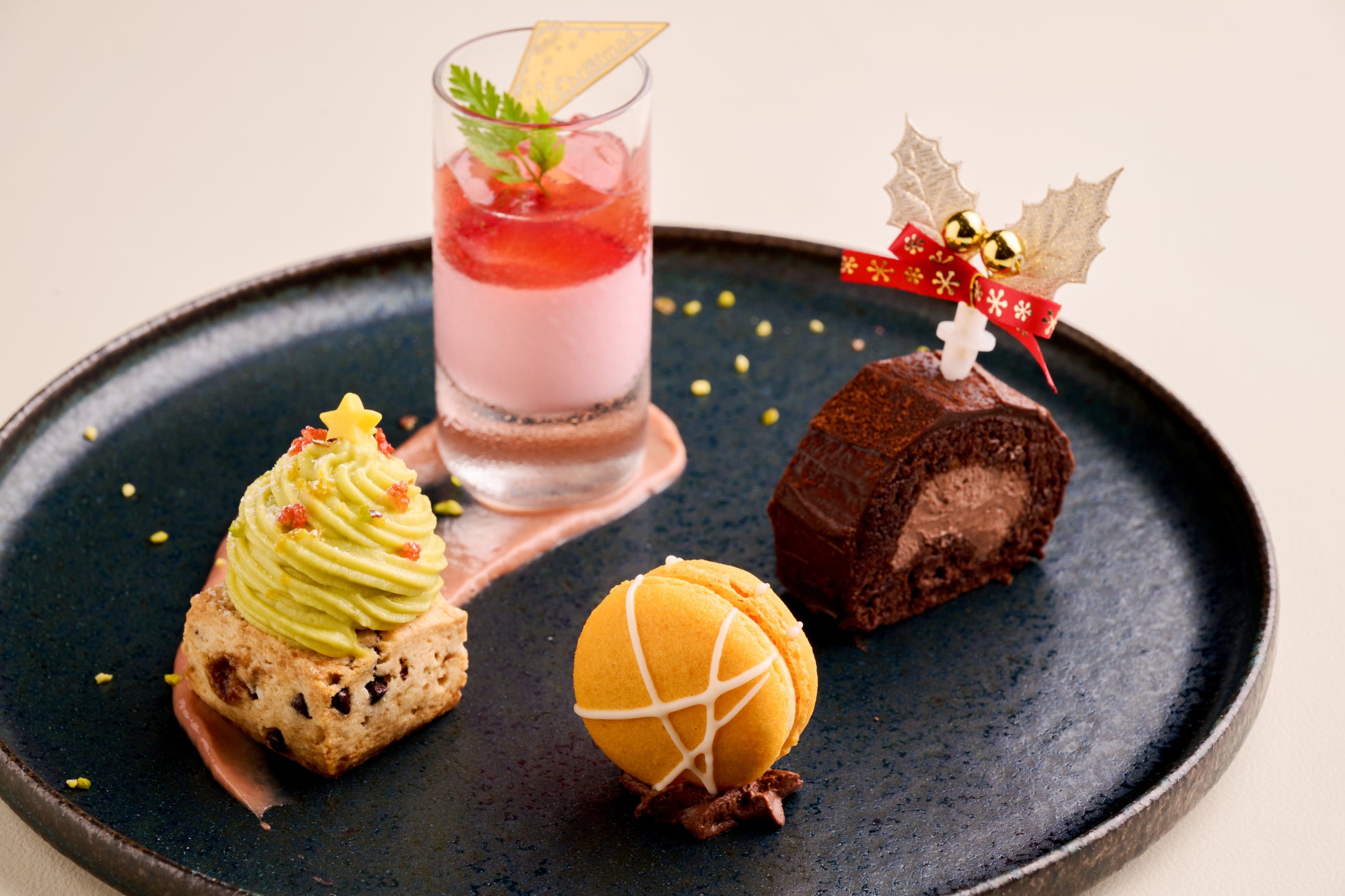 サクっと焼き上げたクランベリーのスコーンには、ピスタチオクリームのツリーや、苺のコンポートとパンナコッタ。そして小さな「プティ・ノエル」が可憐に並びます。温かい紅茶と相性の良いスイーツを揃えました。